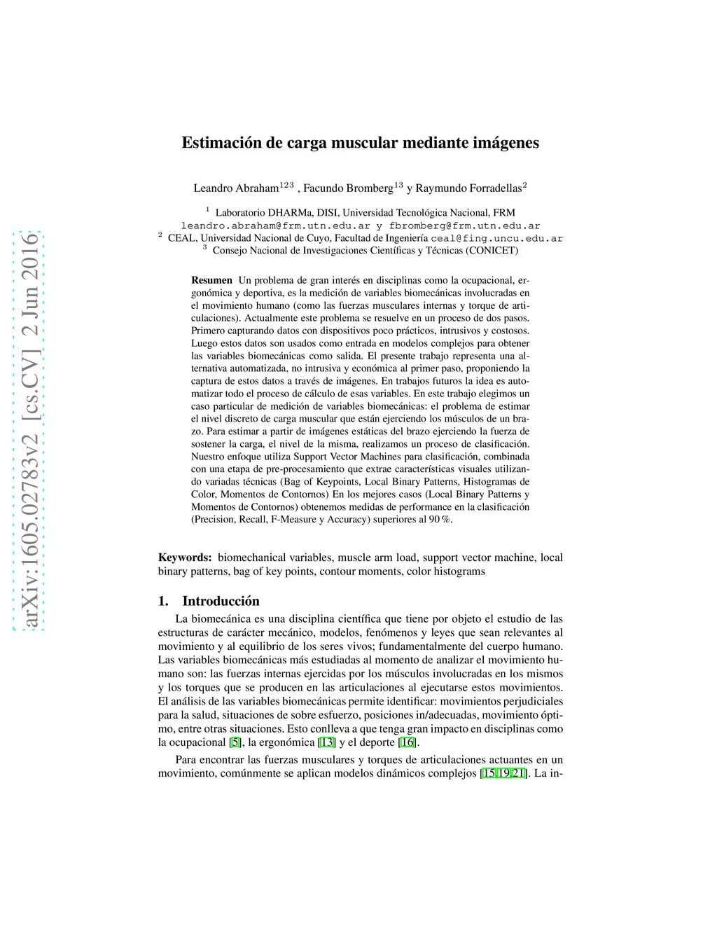 Un problema de gran interes en disciplinas como la ocupacional, ergonomica y deportiva, es la medicion de variables biomecanicas involucradas en el movimiento humano (como las fuerzas musculares internas y torque de articulaciones). Actualmente este problema se resuelve en un proceso de dos pasos. Primero capturando datos con dispositivos poco pr\ácticos, intrusivos y costosos. Luego estos datos son usados como entrada en modelos complejos para obtener las variables biomecanicas como salida. El presente trabajo representa una alternativa automatizada, no intrusiva y economica al primer paso, proponiendo la captura de estos datos a traves de imagenes. En trabajos futuros la idea es automatizar todo el proceso de calculo de esas variables. En este trabajo elegimos un caso particular de medicion de variables biomecanicas: el problema de estimar el nivel discreto de carga muscular que estan ejerciendo los musculos de un brazo. Para estimar a partir de imagenes estaticas del brazo ejerciendo la fuerza de sostener la carga, el nivel de la misma, realizamos un proceso de clasificacion. Nuestro enfoque utiliza Support Vector Machines para clasificacion, combinada con una etapa de pre-procesamiento que extrae caracter{\i}sticas visuales utilizando variadas tecnicas (Bag of Keypoints, Local Binary Patterns, Histogramas de Color, Momentos de Contornos) En los mejores casos (Local Binary Patterns y Momentos de Contornos) obtenemos medidas de performance en la clasificacion (Precision, Recall, F-Measure y Accuracy) superiores al 90 %.