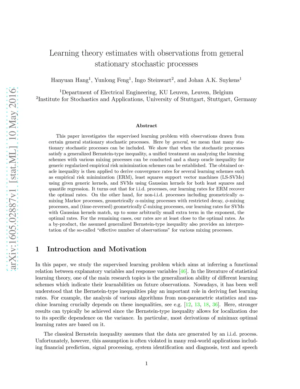 This paper investigates the supervised learning problem with observations drawn from certain general stationary stochastic processes. Here by \emph{general}, we mean that many stationary stochastic processes can be included. We show that when the stochastic processes satisfy a generalized Bernstein-type inequality, a unified treatment on analyzing the learning schemes with various mixing processes can be conducted and a sharp oracle inequality for generic regularized empirical risk minimization schemes can be established. The obtained oracle inequality is then applied to derive convergence rates for several learning schemes such as empirical risk minimization (ERM), least squares support vector machines (LS-SVMs) using given generic kernels, and SVMs using Gaussian kernels for both least squares and quantile regression. It turns out that for i.i.d.~processes, our learning rates for ERM recover the optimal rates. On the other hand, for non-i.i.d.~processes including geometrically -mixing Markov processes, geometrically -mixing processes with restricted decay, -mixing processes, and (time-reversed) geometrically -mixing processes, our learning rates for SVMs with Gaussian kernels match, up to some arbitrarily small extra term in the exponent, the optimal rates. For the remaining cases, our rates are at least close to the optimal rates. As a by-product, the assumed generalized Bernstein-type inequality also provides an interpretation of the so-called "effective number of observations" for various mixing processes.