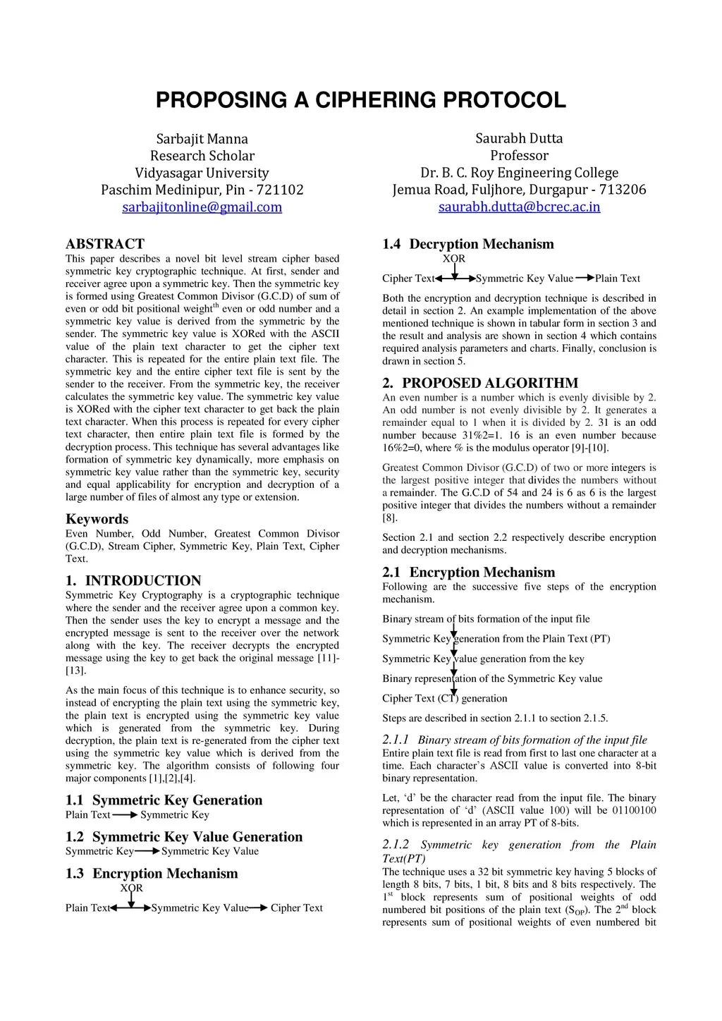 This paper describes a novel bit level stream cipher based symmetric key cryptographic technique. At first, sender and receiver agree upon a symmetric key. Then the symmetric key is formed using Greatest Common Divisor (G.C.D) of sum of even or odd bit positional weightth even or odd number and a symmetric key value is derived from the symmetric by the sender. The symmetric key value is XORed with the ASCII value of the plain text character to get the cipher text character. This is repeated for the entire plain text file. The symmetric key and the entire cipher text file is sent by the sender to the receiver. From the symmetric key, the receiver calculates the symmetric key value. The symmetric key value is XORed with the cipher text character to get back the plain text character. When this process is repeated for every cipher text character, then entire plain text file is formed by the decryption process. This technique has several advantages like formation of symmetric key dynamically, more emphasis on symmetric key value rather than the symmetric key, security and equal applicability for encryption and decryption of a large number of files of almost any type or extension.