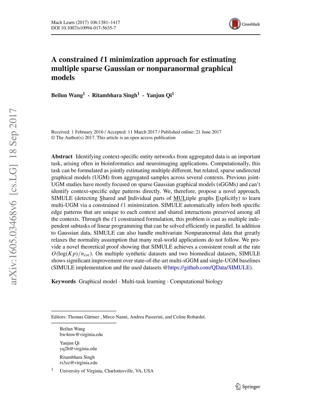 Identifying context-specific entity networks from aggregated data is an important task, arising often in bioinformatics and neuroimaging. Computationally, this task can be formulated as jointly estimating multiple different, but related, sparse Undirected Graphical Models (UGM) from aggregated samples across several contexts. Previous joint-UGM studies have mostly focused on sparse Gaussian Graphical Models (sGGMs) and can't identify context-specific edge patterns directly. We, therefore, propose a novel approach, SIMULE (detecting Shared and Individual parts of MULtiple graphs Explicitly) to learn multi-UGM via a constrained L1 minimization. SIMULE automatically infers both specific edge patterns that are unique to each context and shared interactions preserved among all the contexts. Through the L1 constrained formulation, this problem is cast as multiple independent subtasks of linear programming that can be solved efficiently in parallel. In addition to Gaussian data, SIMULE can also handle multivariate Nonparanormal data that greatly relaxes the normality assumption that many real-world applications do not follow. We provide a novel theoretical proof showing that SIMULE achieves a consistent result at the rate O(log(Kp)/n_{tot}). On multiple synthetic datasets and two biomedical datasets, SIMULE shows significant improvement over state-of-the-art multi-sGGM and single-UGM baselines.