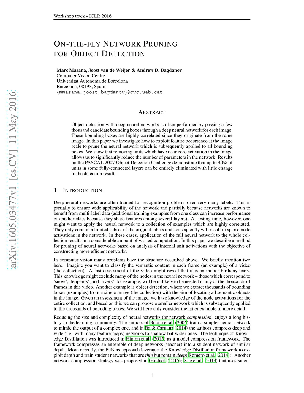 Object detection with deep neural networks is often performed by passing a few thousand candidate bounding boxes through a deep neural network for each image. These bounding boxes are highly correlated since they originate from the same image. In this paper we investigate how to exploit feature occurrence at the image scale to prune the neural network which is subsequently applied to all bounding boxes. We show that removing units which have near-zero activation in the image allows us to significantly reduce the number of parameters in the network. Results on the PASCAL 2007 Object Detection Challenge demonstrate that up to 40% of units in some fully-connected layers can be entirely eliminated with little change in the detection result.