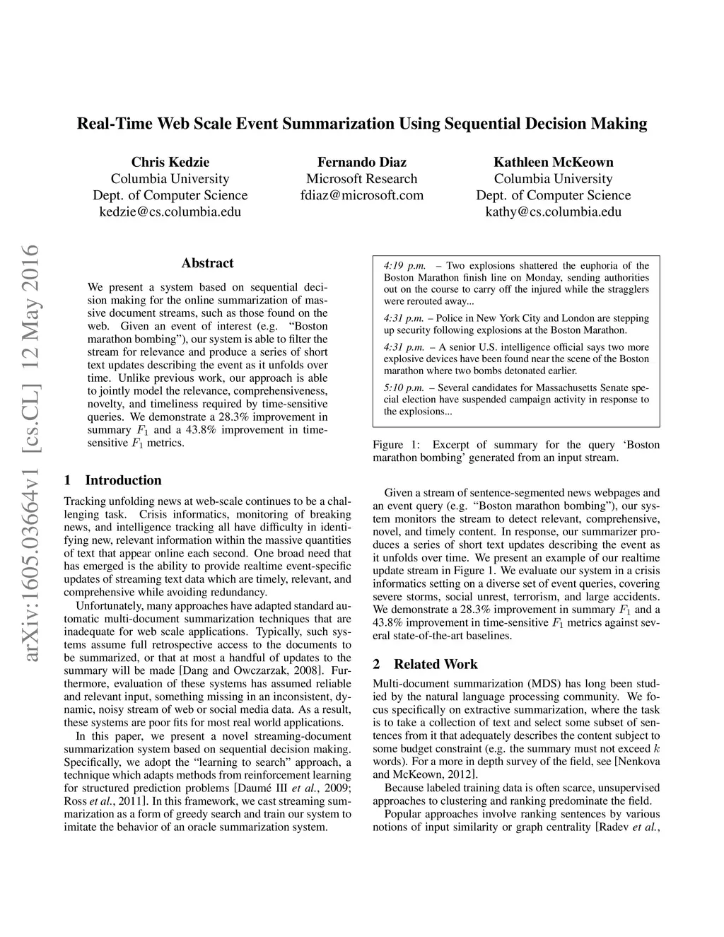 We present a system based on sequential decision making for the online summarization of massive document streams, such as those found on the web. Given an event of interest (e.g. "Boston marathon bombing"), our system is able to filter the stream for relevance and produce a series of short text updates describing the event as it unfolds over time. Unlike previous work, our approach is able to jointly model the relevance, comprehensiveness, novelty, and timeliness required by time-sensitive queries. We demonstrate a 28.3% improvement in summary F1 and a 43.8% improvement in time-sensitive F1 metrics.