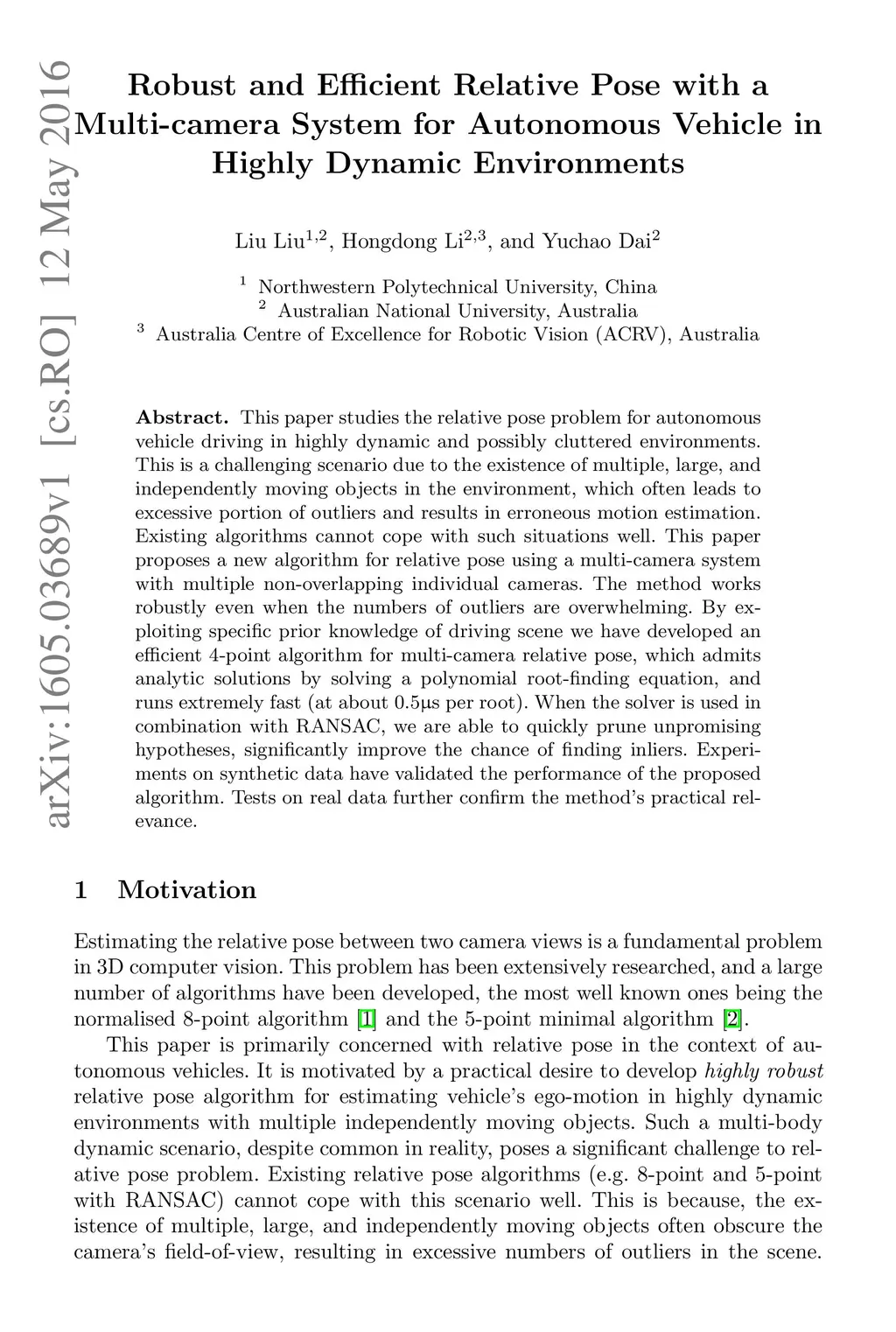 This paper studies the relative pose problem for autonomous vehicle driving in highly dynamic and possibly cluttered environments. This is a challenging scenario due to the existence of multiple, large, and independently moving objects in the environment, which often leads to excessive portion of outliers and results in erroneous motion estimation. Existing algorithms cannot cope with such situations well. This paper proposes a new algorithm for relative pose using a multi-camera system with multiple non-overlapping individual cameras. The method works robustly even when the numbers of outliers are overwhelming. By exploiting specific prior knowledge of driving scene we have developed an efficient 4-point algorithm for multi-camera relative pose, which admits analytic solutions by solving a polynomial root-finding equation, and runs extremely fast (at about 0.5s per root). When the solver is used in combination with RANSAC, we are able to quickly prune unpromising hypotheses, significantly improve the chance of finding inliers. Experiments on synthetic data have validated the performance of the proposed algorithm. Tests on real data further confirm the method's practical relevance.