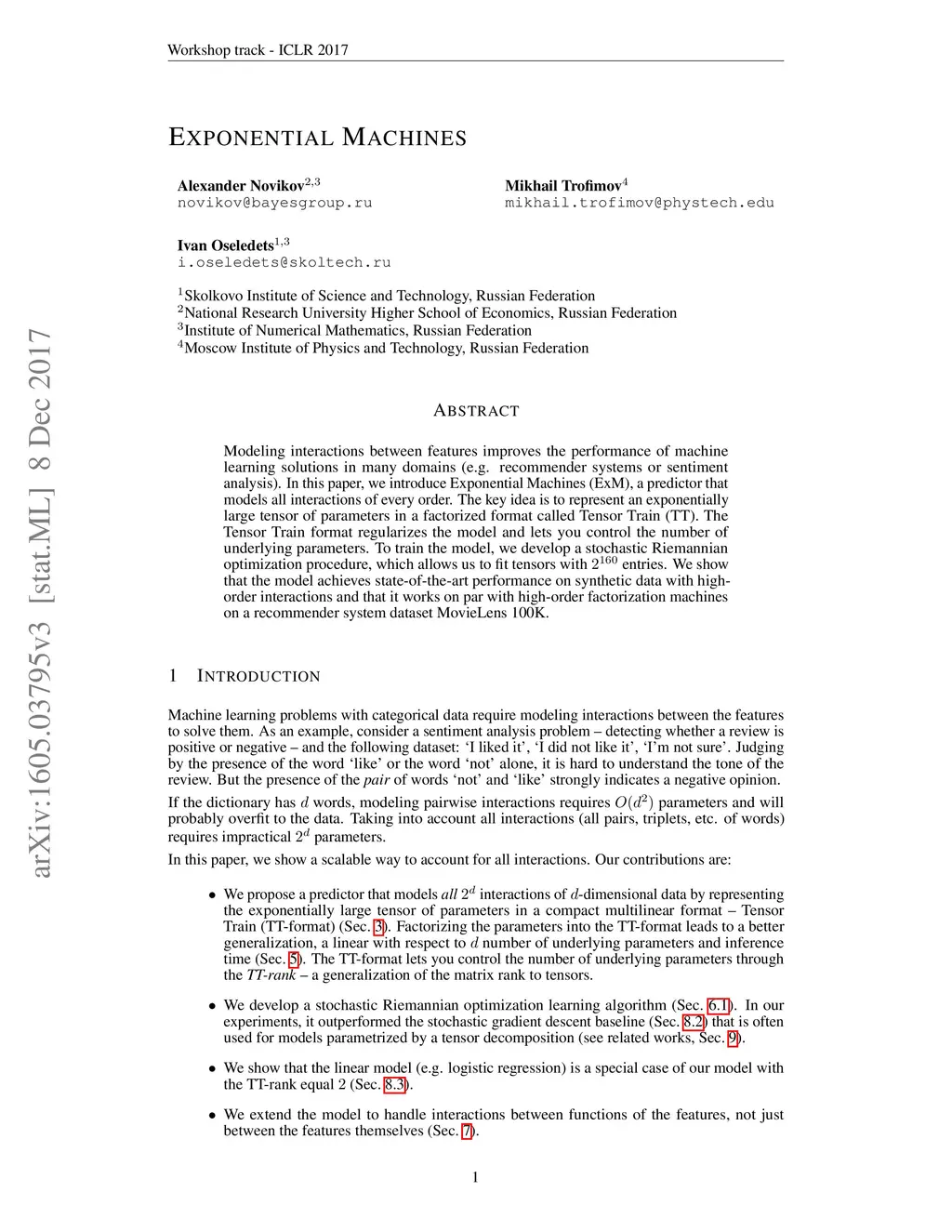Modeling interactions between features improves the performance of machine learning solutions in many domains (e.g. recommender systems or sentiment analysis). In this paper, we introduce Exponential Machines (ExM), a predictor that models all interactions of every order. The key idea is to represent an exponentially large tensor of parameters in a factorized format called Tensor Train (TT). The Tensor Train format regularizes the model and lets you control the number of underlying parameters. To train the model, we develop a stochastic Riemannian optimization procedure, which allows us to fit tensors with 2^160 entries. We show that the model achieves state-of-the-art performance on synthetic data with high-order interactions and that it works on par with high-order factorization machines on a recommender system dataset MovieLens 100K.