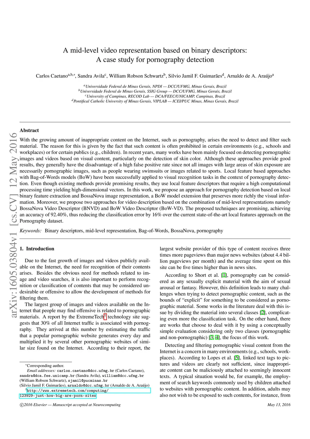 With the growing amount of inappropriate content on the Internet, such as pornography, arises the need to detect and filter such material. The reason for this is given by the fact that such content is often prohibited in certain environments (e.g., schools and workplaces) or for certain publics (e.g., children). In recent years, many works have been mainly focused on detecting pornographic images and videos based on visual content, particularly on the detection of skin color. Although these approaches provide good results, they generally have the disadvantage of a high false positive rate since not all images with large areas of skin exposure are necessarily pornographic images, such as people wearing swimsuits or images related to sports. Local feature based approaches with Bag-of-Words models (BoW) have been successfully applied to visual recognition tasks in the context of pornography detection. Even though existing methods provide promising results, they use local feature descriptors that require a high computational processing time yielding high-dimensional vectors. In this work, we propose an approach for pornography detection based on local binary feature extraction and BossaNova image representation, a BoW model extension that preserves more richly the visual information. Moreover, we propose two approaches for video description based on the combination of mid-level representations namely BossaNova Video Descriptor (BNVD) and BoW Video Descriptor (BoW-VD). The proposed techniques are promising, achieving an accuracy of 92.40%, thus reducing the classification error by 16% over the current state-of-the-art local features approach on the Pornography dataset.