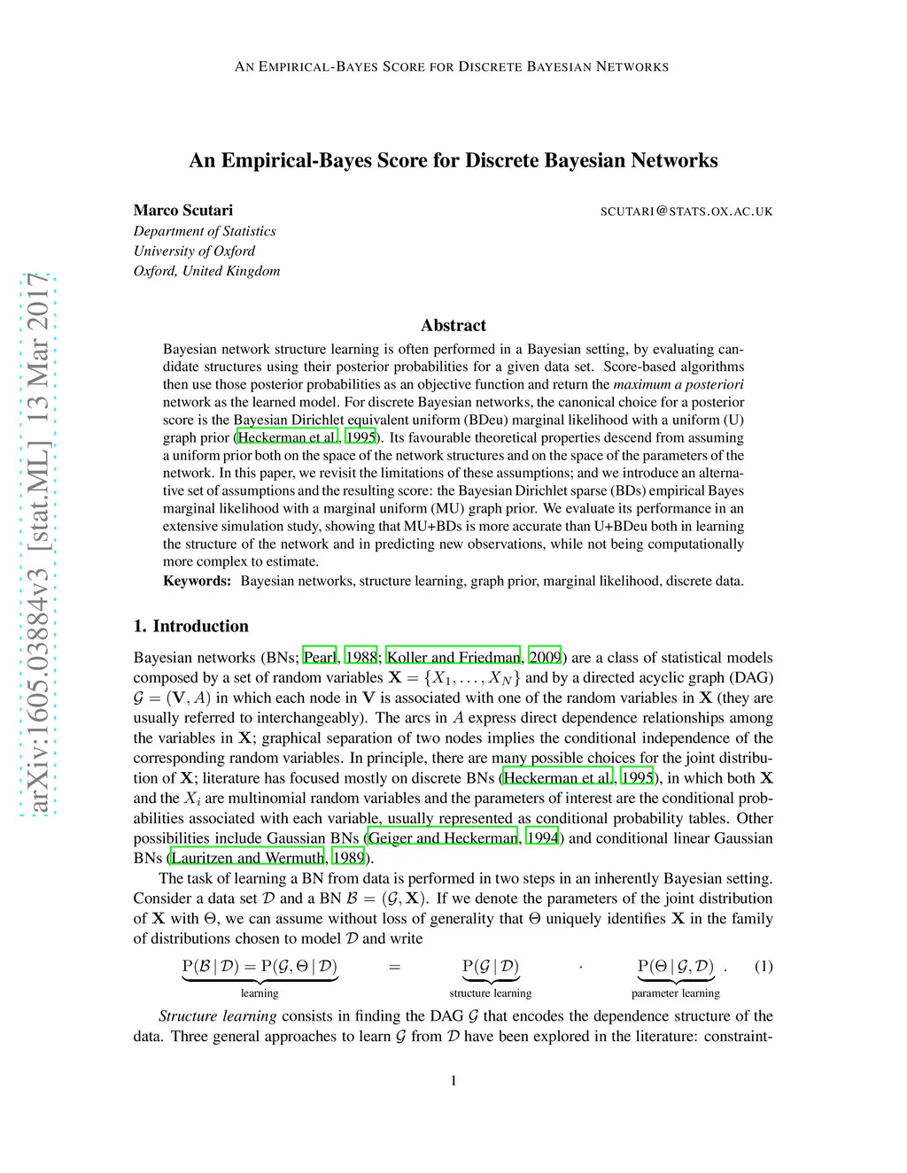 Bayesian network structure learning is often performed in a Bayesian setting, by evaluating candidate structures using their posterior probabilities for a given data set. Score-based algorithms then use those posterior probabilities as an objective function and return the maximum a posteriori network as the learned model. For discrete Bayesian networks, the canonical choice for a posterior score is the Bayesian Dirichlet equivalent uniform (BDeu) marginal likelihood with a uniform (U) graph prior (Heckerman et al., 1995). Its favourable theoretical properties descend from assuming a uniform prior both on the space of the network structures and on the space of the parameters of the network. In this paper, we revisit the limitations of these assumptions; and we introduce an alternative set of assumptions and the resulting score: the Bayesian Dirichlet sparse (BDs) empirical Bayes marginal likelihood with a marginal uniform (MU) graph prior. We evaluate its performance in an extensive simulation study, showing that MU+BDs is more accurate than U+BDeu both in learning the structure of the network and in predicting new observations, while not being computationally more complex to estimate.