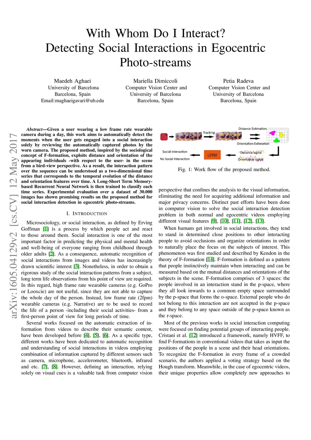 Given a user wearing a low frame rate wearable camera during a day, this work aims to automatically detect the moments when the user gets engaged into a social interaction solely by reviewing the automatically captured photos by the worn camera. The proposed method, inspired by the sociological concept of F-formation, exploits distance and orientation of the appearing individuals -with respect to the user- in the scene from a bird-view perspective. As a result, the interaction pattern over the sequence can be understood as a two-dimensional time series that corresponds to the temporal evolution of the distance and orientation features over time. A Long-Short Term Memory-based Recurrent Neural Network is then trained to classify each time series. Experimental evaluation over a dataset of 30.000 images has shown promising results on the proposed method for social interaction detection in egocentric photo-streams.