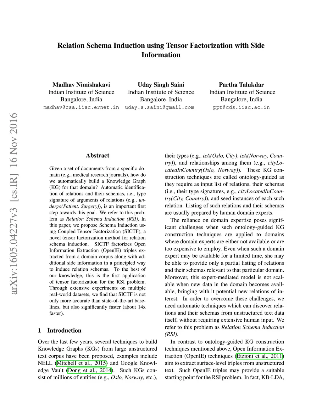 Given a set of documents from a specific domain (e.g., medical research journals), how do we automatically build a Knowledge Graph (KG) for that domain? Automatic identification of relations and their schemas, i.e., type signature of arguments of relations (e.g., undergo(Patient, Surgery)), is an important first step towards this goal. We refer to this problem as Relation Schema Induction (RSI). In this paper, we propose Schema Induction using Coupled Tensor Factorization (SICTF), a novel tensor factorization method for relation schema induction. SICTF factorizes Open Information Extraction (OpenIE) triples extracted from a domain corpus along with additional side information in a principled way to induce relation schemas. To the best of our knowledge, this is the first application of tensor factorization for the RSI problem. Through extensive experiments on multiple real-world datasets, we find that SICTF is not only more accurate than state-of-the-art baselines, but also significantly faster (about 14x faster).