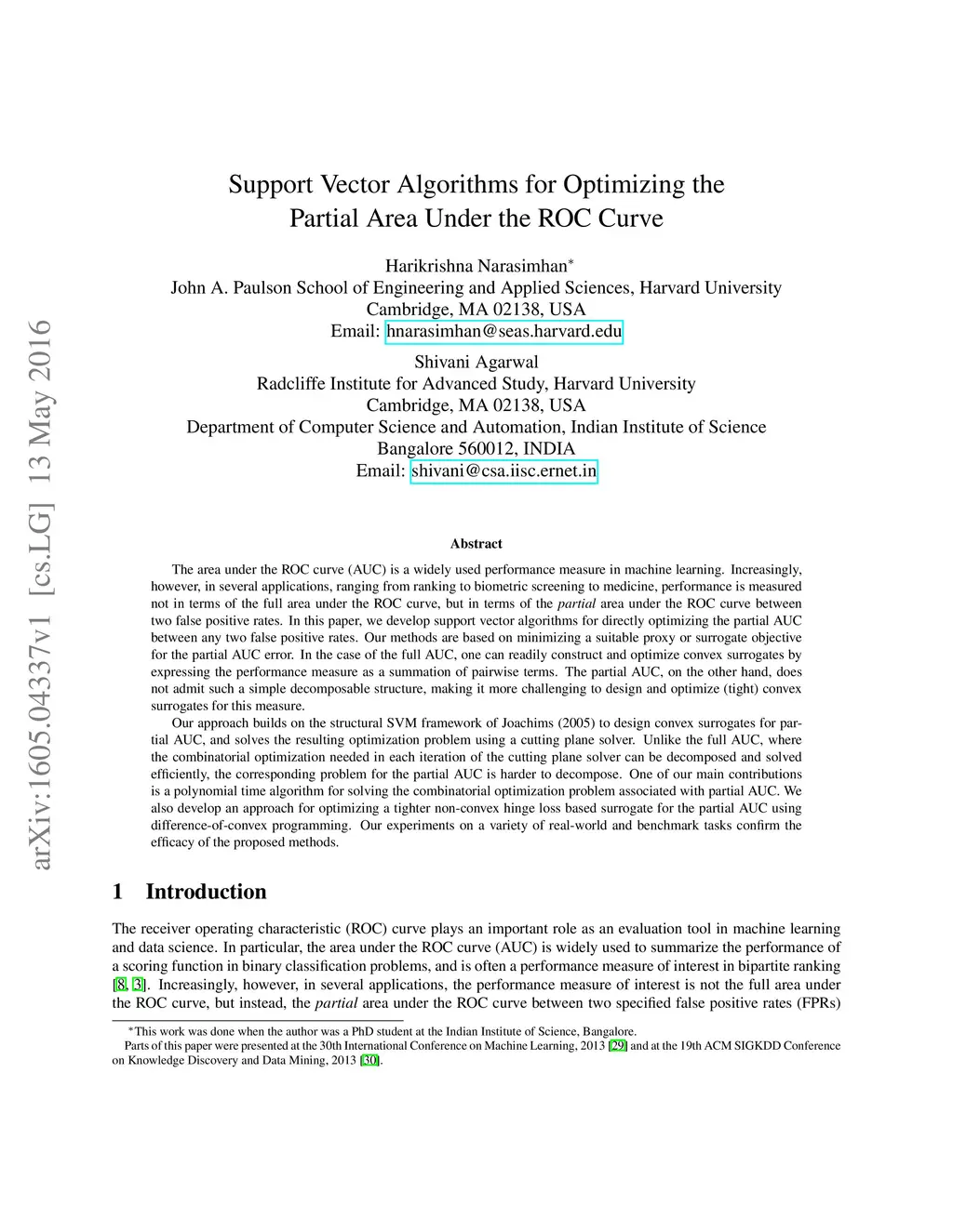 The area under the ROC curve (AUC) is a widely used performance measure in machine learning. Increasingly, however, in several applications, ranging from ranking to biometric screening to medicine, performance is measured not in terms of the full area under the ROC curve, but in terms of the \emph{partial} area under the ROC curve between two false positive rates. In this paper, we develop support vector algorithms for directly optimizing the partial AUC between any two false positive rates. Our methods are based on minimizing a suitable proxy or surrogate objective for the partial AUC error. In the case of the full AUC, one can readily construct and optimize convex surrogates by expressing the performance measure as a summation of pairwise terms. The partial AUC, on the other hand, does not admit such a simple decomposable structure, making it more challenging to design and optimize (tight) convex surrogates for this measure. Our approach builds on the structural SVM framework of Joachims (2005) to design convex surrogates for partial AUC, and solves the resulting optimization problem using a cutting plane solver. Unlike the full AUC, where the combinatorial optimization needed in each iteration of the cutting plane solver can be decomposed and solved efficiently, the corresponding problem for the partial AUC is harder to decompose. One of our main contributions is a polynomial time algorithm for solving the combinatorial optimization problem associated with partial AUC. We also develop an approach for optimizing a tighter non-convex hinge loss based surrogate for the partial AUC using difference-of-convex programming. Our experiments on a variety of real-world and benchmark tasks confirm the efficacy of the proposed methods.