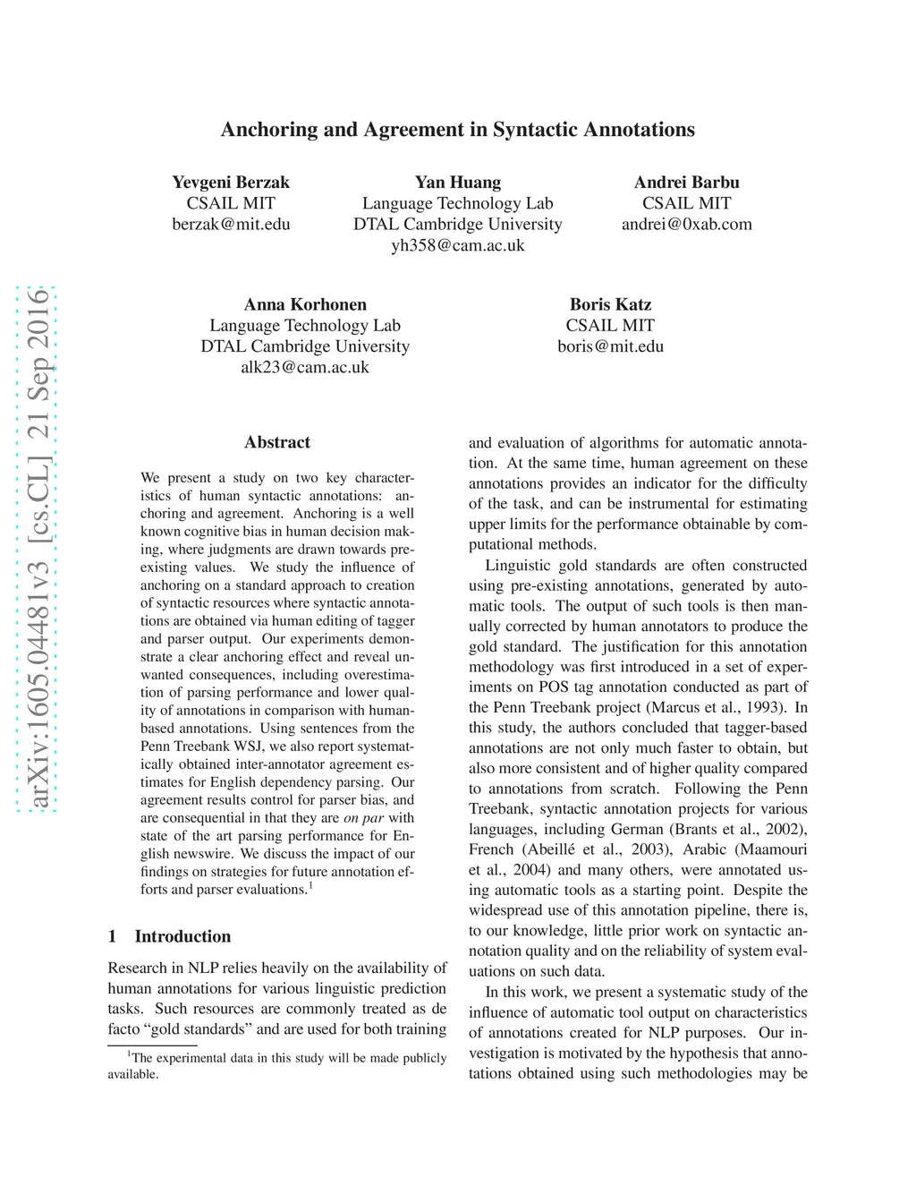 We present a study on two key characteristics of human syntactic annotations: anchoring and agreement. Anchoring is a well known cognitive bias in human decision making, where judgments are drawn towards pre-existing values. We study the influence of anchoring on a standard approach to creation of syntactic resources where syntactic annotations are obtained via human editing of tagger and parser output. Our experiments demonstrate a clear anchoring effect and reveal unwanted consequences, including overestimation of parsing performance and lower quality of annotations in comparison with human-based annotations. Using sentences from the Penn Treebank WSJ, we also report systematically obtained inter-annotator agreement estimates for English dependency parsing. Our agreement results control for parser bias, and are consequential in that they are on par with state of the art parsing performance for English newswire. We discuss the impact of our findings on strategies for future annotation efforts and parser evaluations.