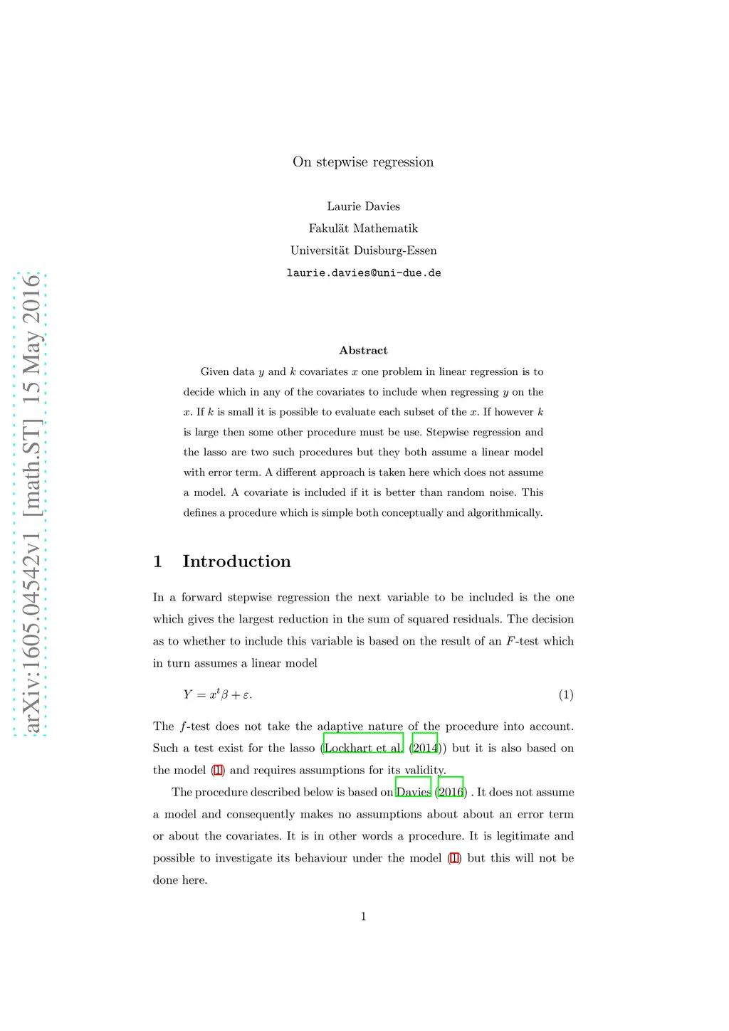 Given data and covariates one problem in linear regression is to decide which in any of the covariates to include when regressing on the . If is small it is possible to evaluate each subset of the . If however is large then some other procedure must be use. Stepwise regression and the lasso are two such procedures but they both assume a linear model with error term. A different approach is taken here which does not assume a model. A covariate is included if it is better than random noise. This defines a procedure which is simple both conceptually and algorithmically