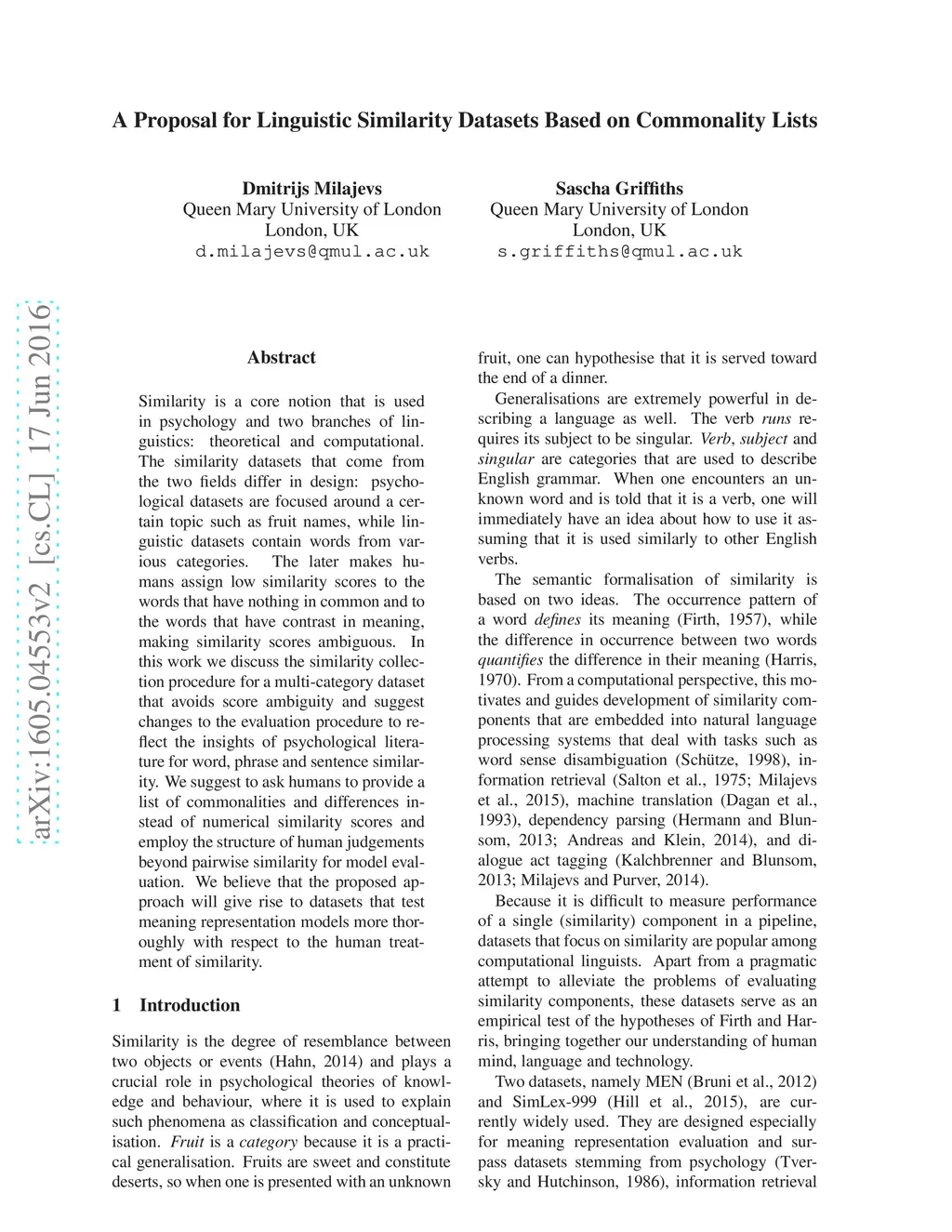 A Proposal for Linguistic Similarity Datasets Based on Commonality Lists