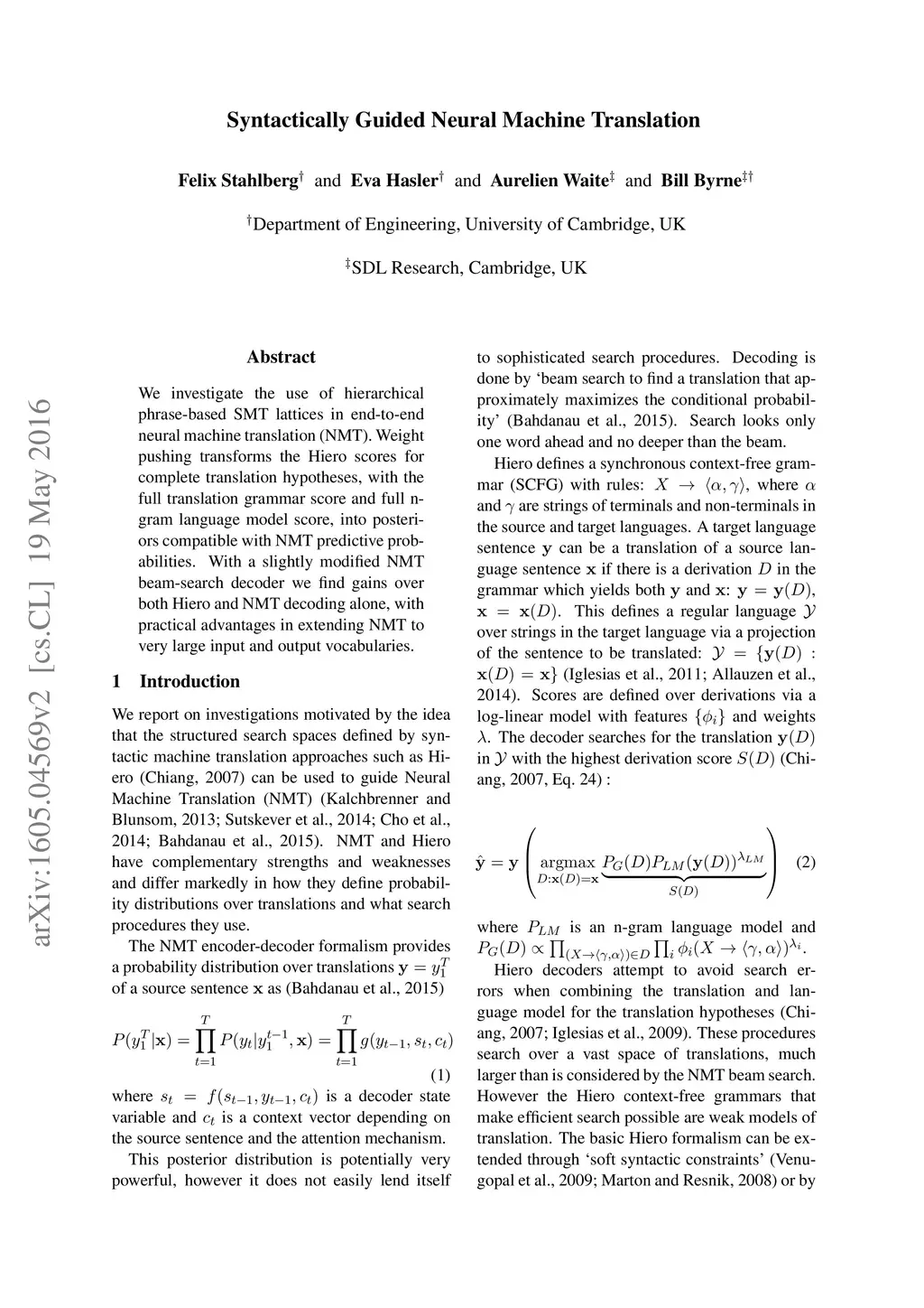 We investigate the use of hierarchical phrase-based SMT lattices in end-to-end neural machine translation (NMT). Weight pushing transforms the Hiero scores for complete translation hypotheses, with the full translation grammar score and full n-gram language model score, into posteriors compatible with NMT predictive probabilities. With a slightly modified NMT beam-search decoder we find gains over both Hiero and NMT decoding alone, with practical advantages in extending NMT to very large input and output vocabularies.