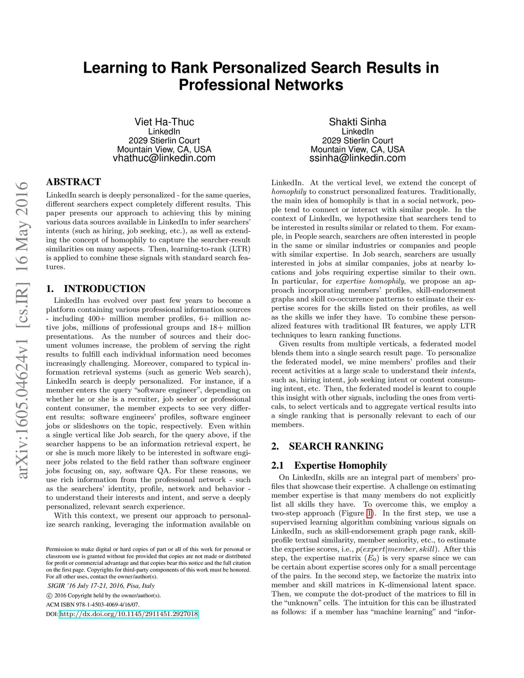 LinkedIn search is deeply personalized - for the same queries, different searchers expect completely different results. This paper presents our approach to achieving this by mining various data sources available in LinkedIn to infer searchers' intents (such as hiring, job seeking, etc.), as well as extending the concept of homophily to capture the searcher-result similarities on many aspects. Then, learning-to-rank (LTR) is applied to combine these signals with standard search features.