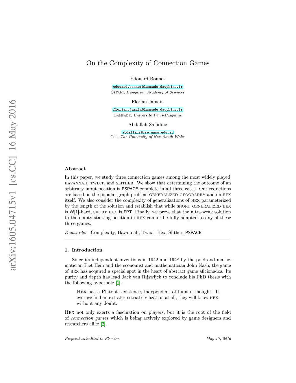 In this paper, we study three connection games among the most widely played: Havannah, Twixt, and Slither. We show that determining the outcome of an arbitrary input position is PSPACE-complete in all three cases. Our reductions are based on the popular graph problem Generalized Geography and on Hex itself. We also consider the complexity of generalizations of Hex parameterized by the length of the solution and establish that while Short Generalized Hex is W[1]-hard, Short Hex is FPT. Finally, we prove that the ultra-weak solution to the empty starting position in hex cannot be fully adapted to any of these three games.