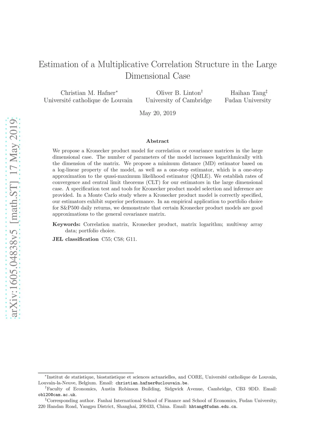 We propose a Kronecker product model for correlation or covariance matrices in the large dimensional case. The number of parameters of the model increases logarithmically with the dimension of the matrix. We propose a minimum distance (MD) estimator based on a log-linear property of the model, as well as a one-step estimator, which is a one-step approximation to the quasi-maximum likelihood estimator (QMLE). We establish rates of convergence and central limit theorems (CLT) for our estimators in the large dimensional case. A specification test and tools for Kronecker product model selection and inference are provided. In a Monte Carlo study where a Kronecker product model is correctly specified, our estimators exhibit superior performance. In an empirical application to portfolio choice for SP500 daily returns, we demonstrate that certain Kronecker product models are good approximations to the general covariance matrix.
