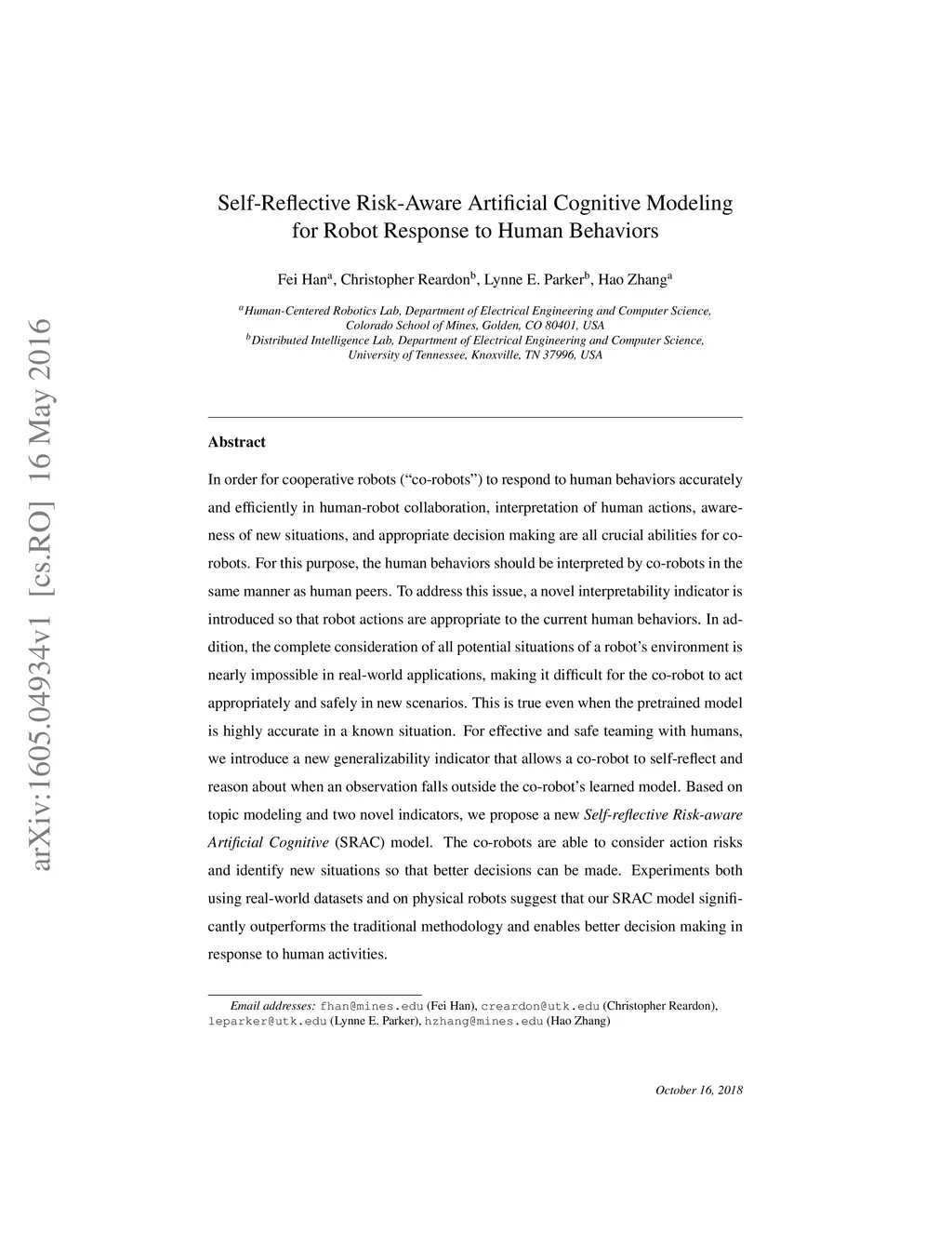 In order for cooperative robots ("co-robots") to respond to human behaviors accurately and efficiently in human-robot collaboration, interpretation of human actions, awareness of new situations, and appropriate decision making are all crucial abilities for co-robots. For this purpose, the human behaviors should be interpreted by co-robots in the same manner as human peers. To address this issue, a novel interpretability indicator is introduced so that robot actions are appropriate to the current human behaviors. In addition, the complete consideration of all potential situations of a robot's environment is nearly impossible in real-world applications, making it difficult for the co-robot to act appropriately and safely in new scenarios. This is true even when the pretrained model is highly accurate in a known situation. For effective and safe teaming with humans, we introduce a new generalizability indicator that allows a co-robot to self-reflect and reason about when an observation falls outside the co-robot's learned model. Based on topic modeling and two novel indicators, we propose a new Self-reflective Risk-aware Artificial Cognitive (SRAC) model. The co-robots are able to consider action risks and identify new situations so that better decisions can be made. Experiments both using real-world datasets and on physical robots suggest that our SRAC model significantly outperforms the traditional methodology and enables better decision making in response to human activities.