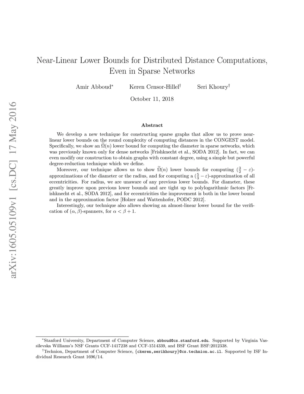 We develop a new technique for constructing sparse graphs that allow us to prove near-linear lower bounds on the round complexity of computing distances in the CONGEST model. Specifically, we show an lower bound for computing the diameter in sparse networks, which was previously known only for dense networks [Frishknecht et al., SODA 2012]. In fact, we can even modify our construction to obtain graphs with constant degree, using a simple but powerful degree-reduction technique which we define. Moreover, our technique allows us to show lower bounds for computing -approximations of the diameter or the radius, and for computing a -approximation of all eccentricities. For radius, we are unaware of any previous lower bounds. For diameter, these greatly improve upon previous lower bounds and are tight up to polylogarithmic factors [Frishknecht et al., SODA 2012], and for eccentricities the improvement is both in the lower bound and in the approximation factor [Holzer and Wattenhofer, PODC 2012]. Interestingly, our technique also allows showing an almost-linear lower bound for the verification of -spanners, for .