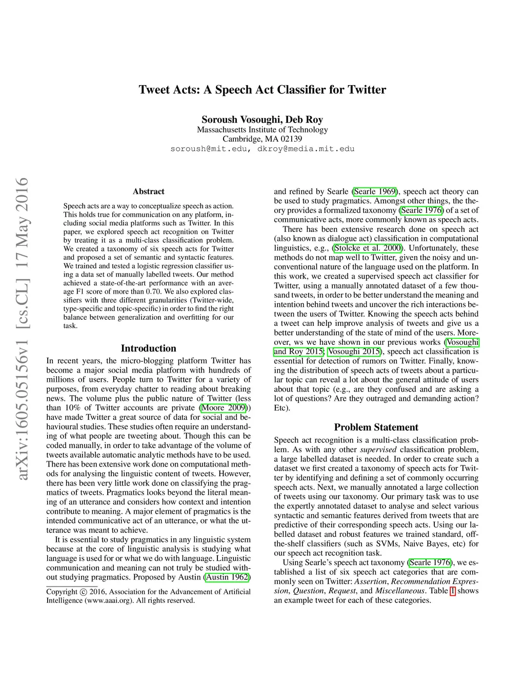 Tweet Acts: A Speech Act Classifier for Twitter