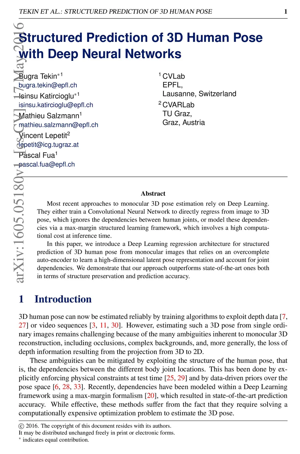 Most recent approaches to monocular 3D pose estimation rely on Deep Learning. They either train a Convolutional Neural Network to directly regress from image to 3D pose, which ignores the dependencies between human joints, or model these dependencies via a max-margin structured learning framework, which involves a high computational cost at inference time. In this paper, we introduce a Deep Learning regression architecture for structured prediction of 3D human pose from monocular images that relies on an overcomplete auto-encoder to learn a high-dimensional latent pose representation and account for joint dependencies. We demonstrate that our approach outperforms state-of-the-art ones both in terms of structure preservation and prediction accuracy.