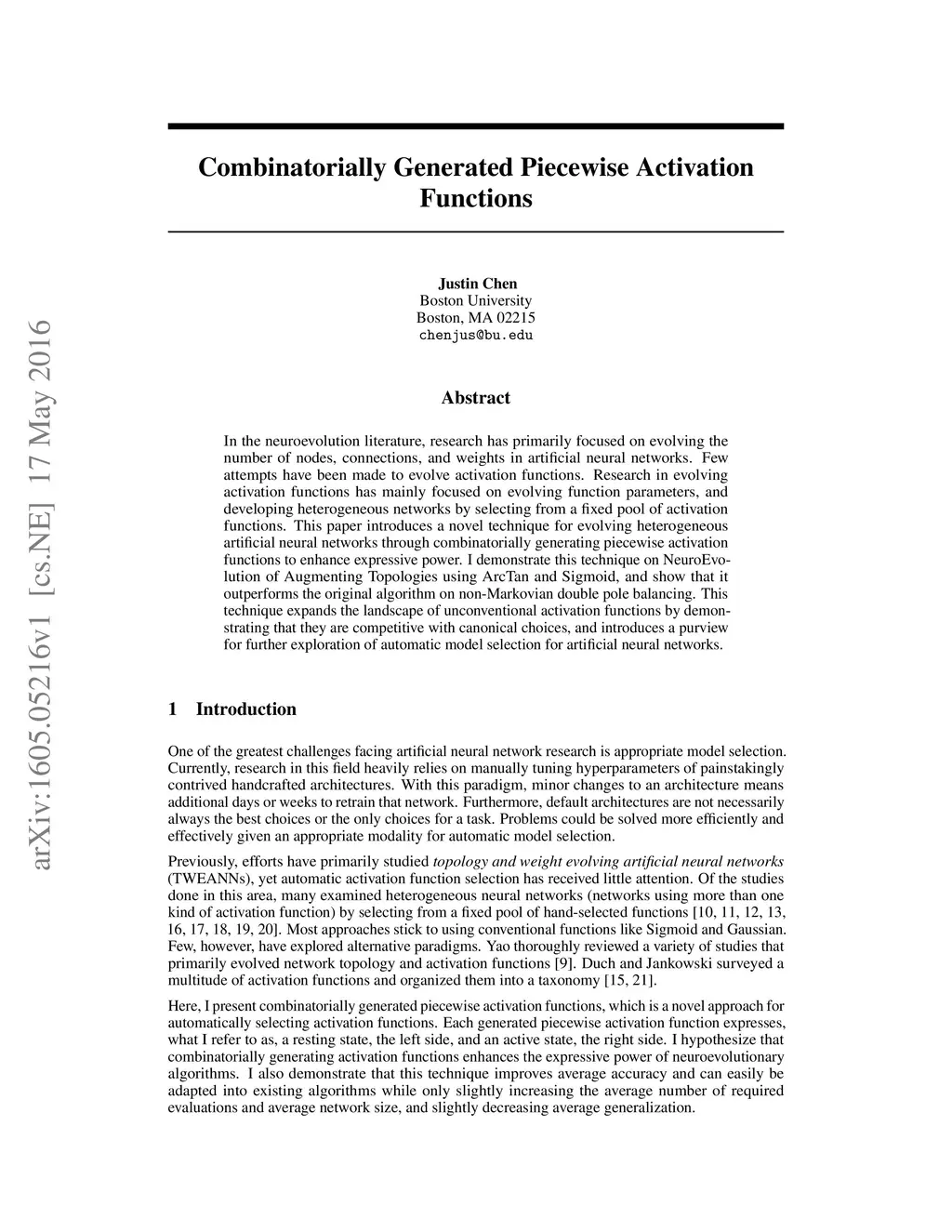 In the neuroevolution literature, research has primarily focused on evolving the number of nodes, connections, and weights in artificial neural networks. Few attempts have been made to evolve activation functions. Research in evolving activation functions has mainly focused on evolving function parameters, and developing heterogeneous networks by selecting from a fixed pool of activation functions. This paper introduces a novel technique for evolving heterogeneous artificial neural networks through combinatorially generating piecewise activation functions to enhance expressive power. I demonstrate this technique on NeuroEvolution of Augmenting Topologies using ArcTan and Sigmoid, and show that it outperforms the original algorithm on non-Markovian double pole balancing. This technique expands the landscape of unconventional activation functions by demonstrating that they are competitive with canonical choices, and introduces a purview for further exploration of automatic model selection for artificial neural networks.