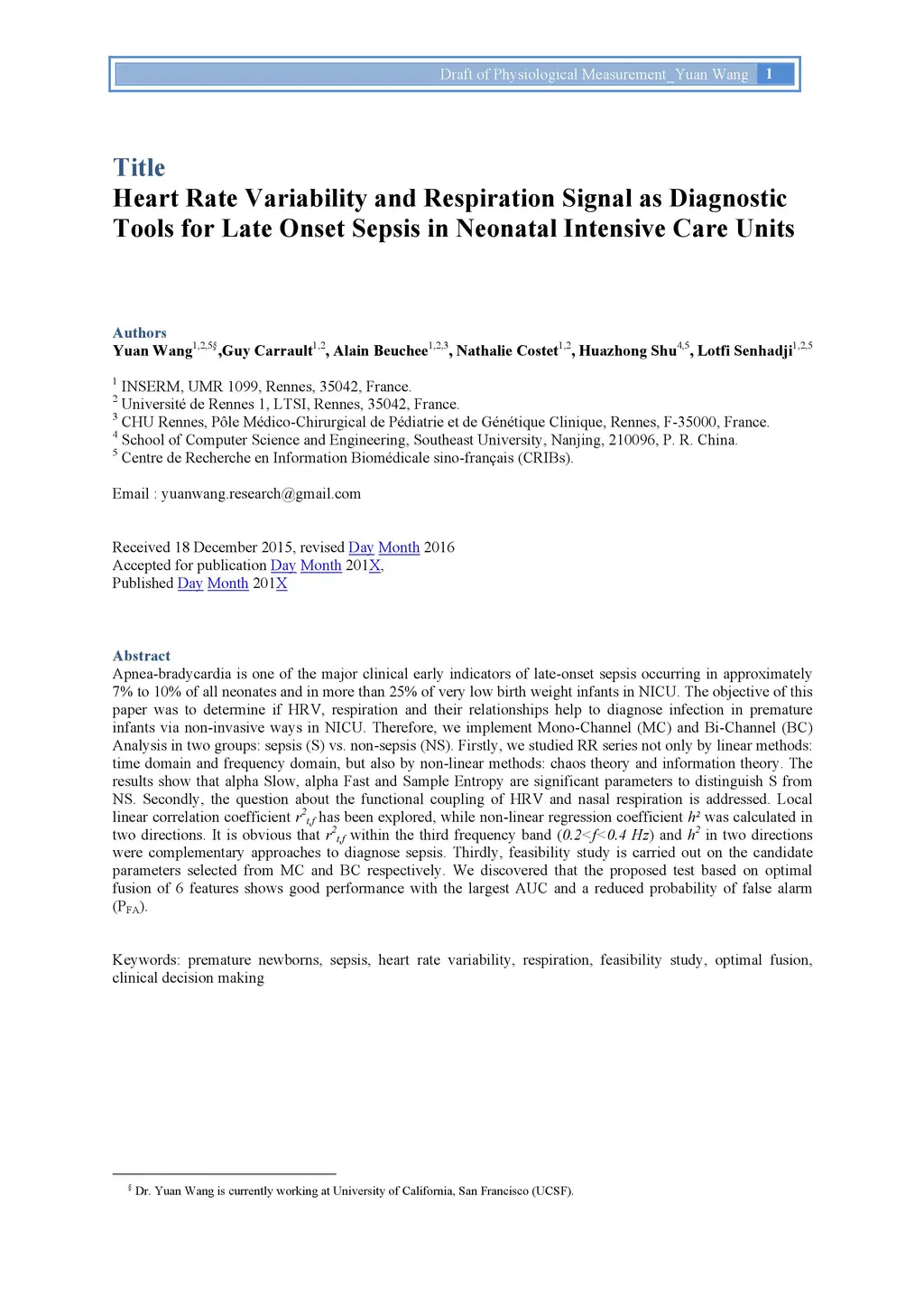 Apnea-bradycardia is one of the major clinical early indicators of late-onset sepsis occurring in approximately 7% to 10% of all neonates and in more than 25% of very low birth weight infants in NICU. The objective of this paper was to determine if HRV, respiration and their relationships help to diagnose infection in premature infants via non-invasive ways in NICU. Therefore, we implement Mono-Channel (MC) and Bi-Channel (BC) Analysis in two groups: sepsis (S) vs. non-sepsis (NS). Firstly, we studied RR series not only by linear methods: time domain and frequency domain, but also by non-linear methods: chaos theory and information theory. The results show that alpha Slow, alpha Fast and Sample Entropy are significant parameters to distinguish S from NS. Secondly, the question about the functional coupling of HRV and nasal respiration is addressed. Local linear correlation coefficient r2t,f has been explored, while non-linear regression coefficient h2 was calculated in two directions. It is obvious that r2t,f within the third frequency band (0.2<f<0.4 Hz) and h2 in two directions were complementary approaches to diagnose sepsis. Thirdly, feasibility study is carried out on the candidate parameters selected from MC and BC respectively. We discovered that the proposed test based on optimal fusion of 6 features shows good performance with the largest AUC and a reduced probability of false alarm (PFA).
