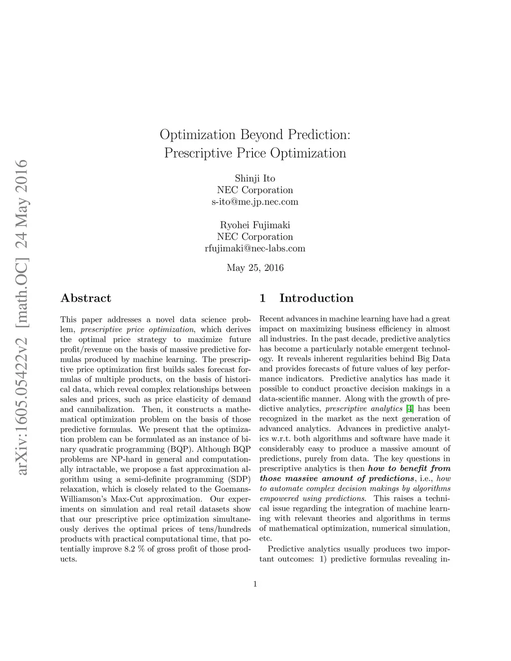 This paper addresses a novel data science problem, prescriptive price optimization, which derives the optimal price strategy to maximize future profit/revenue on the basis of massive predictive formulas produced by machine learning. The prescriptive price optimization first builds sales forecast formulas of multiple products, on the basis of historical data, which reveal complex relationships between sales and prices, such as price elasticity of demand and cannibalization. Then, it constructs a mathematical optimization problem on the basis of those predictive formulas. We present that the optimization problem can be formulated as an instance of binary quadratic programming (BQP). Although BQP problems are NP-hard in general and computationally intractable, we propose a fast approximation algorithm using a semi-definite programming (SDP) relaxation, which is closely related to the Goemans-Williamson's Max-Cut approximation. Our experiments on simulation and real retail datasets show that our prescriptive price optimization simultaneously derives the optimal prices of tens/hundreds products with practical computational time, that potentially improve 8.2% of gross profit of those products.