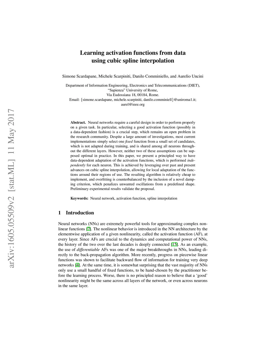 Neural networks require a careful design in order to perform properly on a given task. In particular, selecting a good activation function (possibly in a data-dependent fashion) is a crucial step, which remains an open problem in the research community. Despite a large amount of investigations, most current implementations simply select one fixed function from a small set of candidates, which is not adapted during training, and is shared among all neurons throughout the different layers. However, neither two of these assumptions can be supposed optimal in practice. In this paper, we present a principled way to have data-dependent adaptation of the activation functions, which is performed independently for each neuron. This is achieved by leveraging over past and present advances on cubic spline interpolation, allowing for local adaptation of the functions around their regions of use. The resulting algorithm is relatively cheap to implement, and overfitting is counterbalanced by the inclusion of a novel damping criterion, which penalizes unwanted oscillations from a predefined shape. Experimental results validate the proposal over two well-known benchmarks.