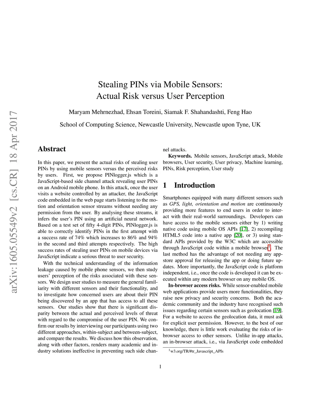 Stealing PINs via Mobile Sensors: Actual Risk versus User Perception