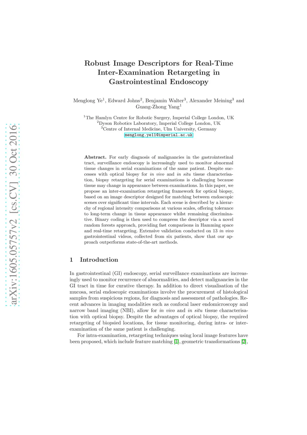 For early diagnosis of malignancies in the gastrointestinal tract, surveillance endoscopy is increasingly used to monitor abnormal tissue changes in serial examinations of the same patient. Despite successes with optical biopsy for in vivo and in situ tissue characterisation, biopsy retargeting for serial examinations is challenging because tissue may change in appearance between examinations. In this paper, we propose an inter-examination retargeting framework for optical biopsy, based on an image descriptor designed for matching between endoscopic scenes over significant time intervals. Each scene is described by a hierarchy of regional intensity comparisons at various scales, offering tolerance to long-term change in tissue appearance whilst remaining discriminative. Binary coding is then used to compress the descriptor via a novel random forests approach, providing fast comparisons in Hamming space and real-time retargeting. Extensive validation conducted on 13 in vivo gastrointestinal videos, collected from six patients, show that our approach outperforms state-of-the-art methods.