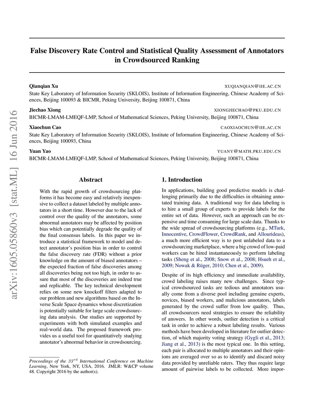 With the rapid growth of crowdsourcing platforms it has become easy and relatively inexpensive to collect a dataset labeled by multiple annotators in a short time. However due to the lack of control over the quality of the annotators, some abnormal annotators may be affected by position bias which can potentially degrade the quality of the final consensus labels. In this paper we introduce a statistical framework to model and detect annotator's position bias in order to control the false discovery rate (FDR) without a prior knowledge on the amount of biased annotators - the expected fraction of false discoveries among all discoveries being not too high, in order to assure that most of the discoveries are indeed true and replicable. The key technical development relies on some new knockoff filters adapted to our problem and new algorithms based on the Inverse Scale Space dynamics whose discretization is potentially suitable for large scale crowdsourcing data analysis. Our studies are supported by experiments with both simulated examples and real-world data. The proposed framework provides us a useful tool for quantitatively studying annotator's abnormal behavior in crowdsourcing data arising from machine learning, sociology, computer vision, multimedia, etc.