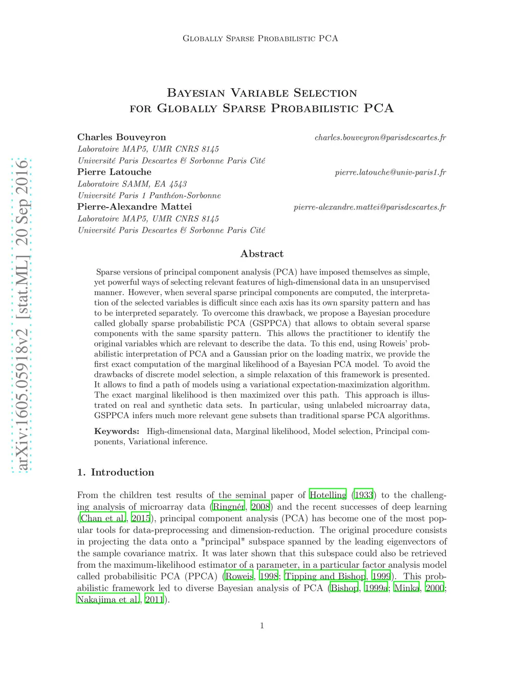 Sparse versions of principal component analysis (PCA) have imposed themselves as simple, yet powerful ways of selecting relevant features of high-dimensional data in an unsupervised manner. However, when several sparse principal components are computed, the interpretation of the selected variables is difficult since each axis has its own sparsity pattern and has to be interpreted separately. To overcome this drawback, we propose a Bayesian procedure called globally sparse probabilistic PCA (GSPPCA) that allows to obtain several sparse components with the same sparsity pattern. This allows the practitioner to identify the original variables which are relevant to describe the data. To this end, using Roweis' probabilistic interpretation of PCA and a Gaussian prior on the loading matrix, we provide the first exact computation of the marginal likelihood of a Bayesian PCA model. To avoid the drawbacks of discrete model selection, a simple relaxation of this framework is presented. It allows to find a path of models using a variational expectation-maximization algorithm. The exact marginal likelihood is then maximized over this path. This approach is illustrated on real and synthetic data sets. In particular, using unlabeled microarray data, GSPPCA infers much more relevant gene subsets than traditional sparse PCA algorithms.