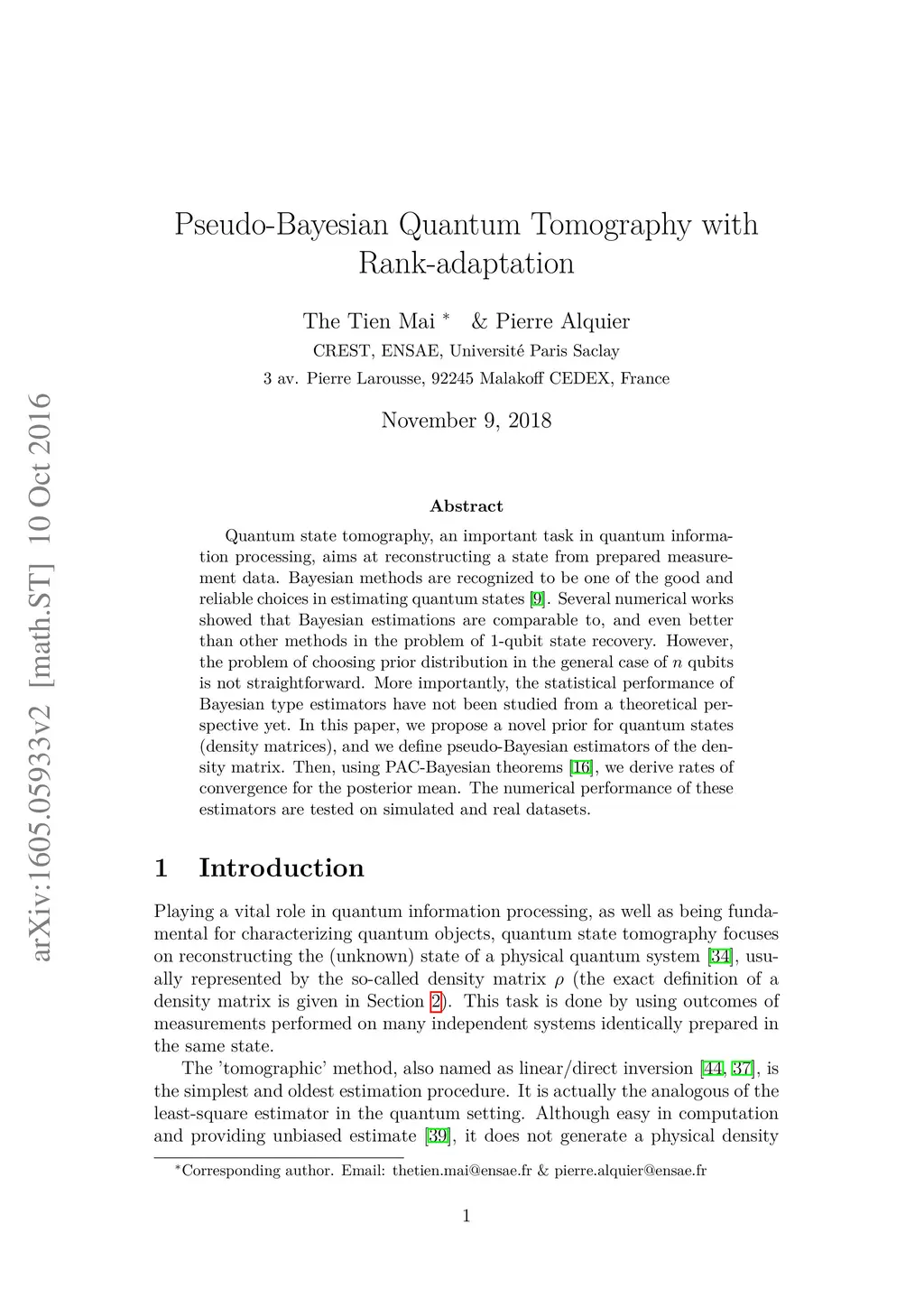 Quantum state tomography, an important task in quantum information processing, aims at reconstructing a state from prepared measurement data. Bayesian methods are recognized to be one of the good and reliable choice in estimating quantum states~\cite{blume2010optimal}. Several numerical works showed that Bayesian estimations are comparable to, and even better than other methods in the problem of -qubit state recovery. However, the problem of choosing prior distribution in the general case of qubits is not straightforward. More importantly, the statistical performance of Bayesian type estimators have not been studied from a theoretical perspective yet. In this paper, we propose a novel prior for quantum states (density matrices), and we define pseudo-Bayesian estimators of the density matrix. Then, using PAC-Bayesian theorems, we derive rates of convergence for the posterior mean. The numerical performance of these estimators are tested on simulated and real datasets.