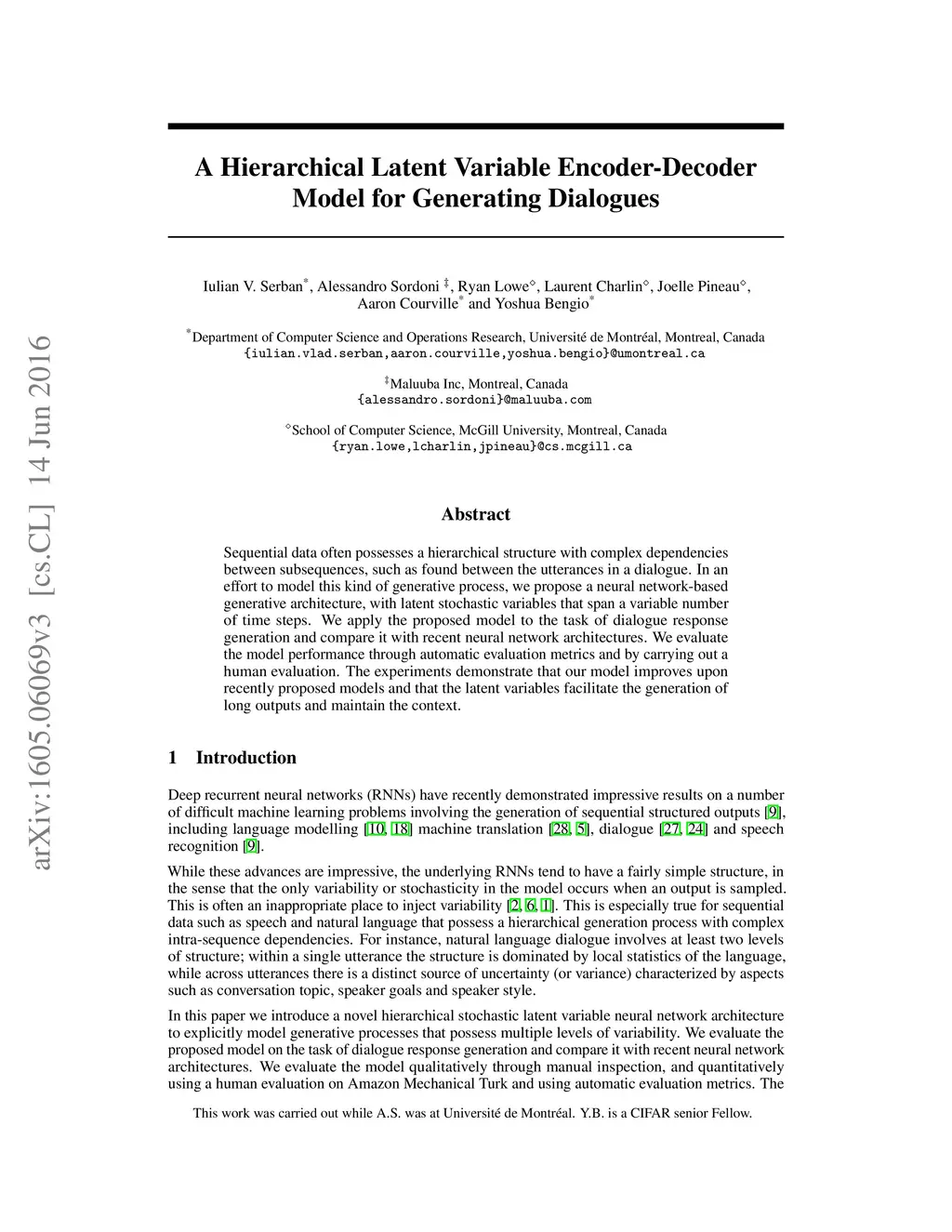 Sequential data often possesses a hierarchical structure with complex dependencies between subsequences, such as found between the utterances in a dialogue. In an effort to model this kind of generative process, we propose a neural network-based generative architecture, with latent stochastic variables that span a variable number of time steps. We apply the proposed model to the task of dialogue response generation and compare it with recent neural network architectures. We evaluate the model performance through automatic evaluation metrics and by carrying out a human evaluation. The experiments demonstrate that our model improves upon recently proposed models and that the latent variables facilitate the generation of long outputs and maintain the context.