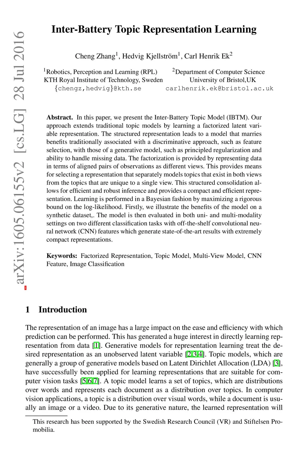 In this paper, we present the Inter-Battery Topic Model (IBTM). Our approach extends traditional topic models by learning a factorized latent variable representation. The structured representation leads to a model that marries benefits traditionally associated with a discriminative approach, such as feature selection, with those of a generative model, such as principled regularization and ability to handle missing data. The factorization is provided by representing data in terms of aligned pairs of observations as different views. This provides means for selecting a representation that separately models topics that exist in both views from the topics that are unique to a single view. This structured consolidation allows for efficient and robust inference and provides a compact and efficient representation. Learning is performed in a Bayesian fashion by maximizing a rigorous bound on the log-likelihood. Firstly, we illustrate the benefits of the model on a synthetic dataset,. The model is then evaluated in both uni- and multi-modality settings on two different classification tasks with off-the-shelf convolutional neural network (CNN) features which generate state-of-the-art results with extremely compact representations.