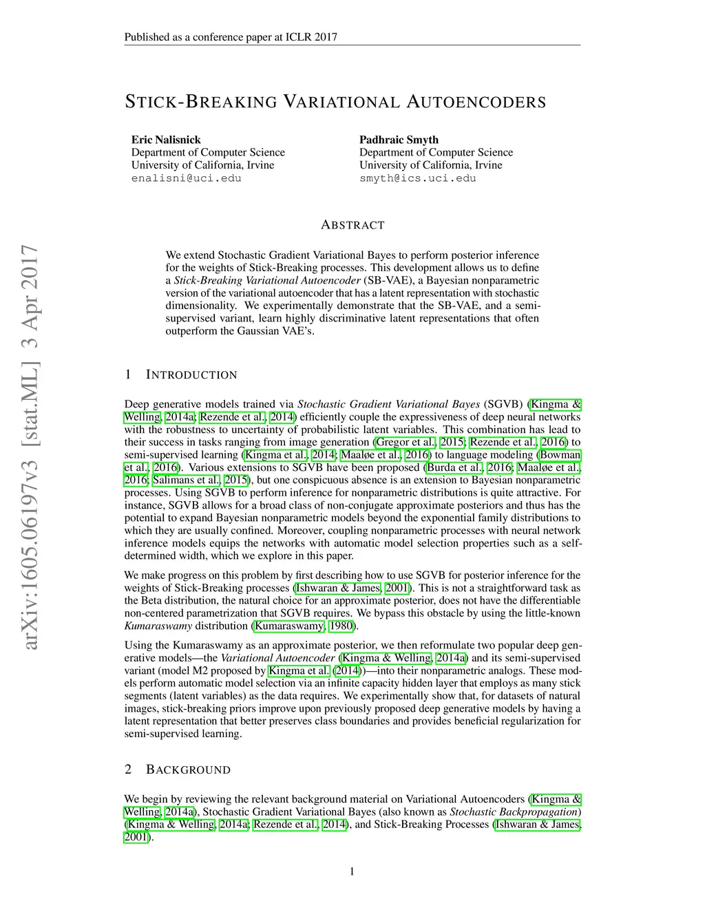 We extend Stochastic Gradient Variational Bayes to perform posterior inference for the weights of Stick-Breaking processes. This development allows us to define a Stick-Breaking Variational Autoencoder (SB-VAE), a Bayesian nonparametric version of the variational autoencoder that has a latent representation with stochastic dimensionality. We experimentally demonstrate that the SB-VAE, and a semi-supervised variant, learn highly discriminative latent representations that often outperform the Gaussian VAE's.