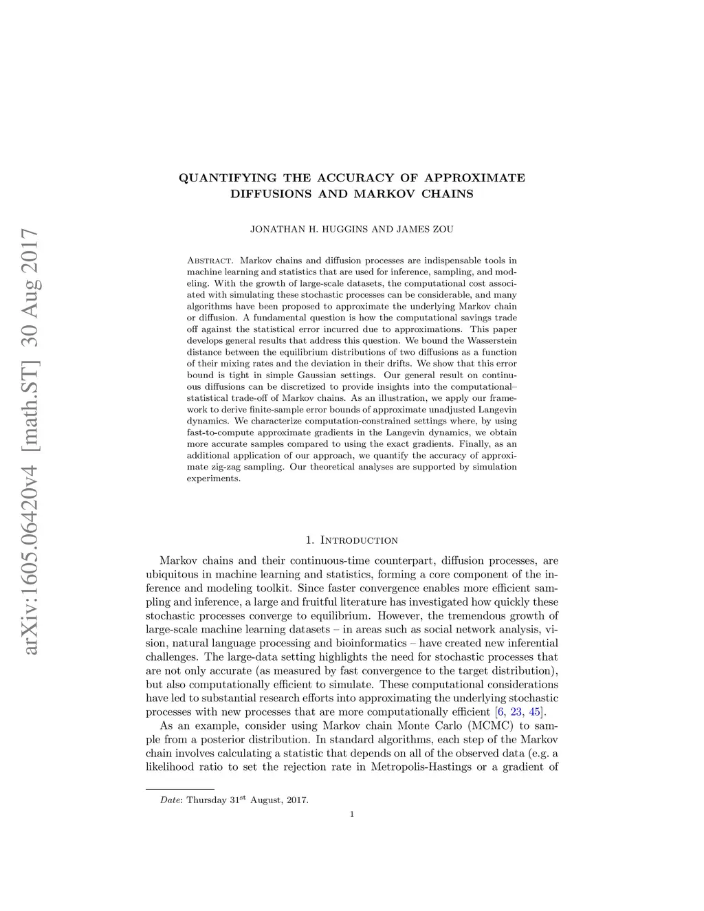 Markov chains and diffusion processes are indispensable tools in machine learning and statistics that are used for inference, sampling, and modeling. With the growth of large-scale datasets, the computational cost associated with simulating these stochastic processes can be considerable, and many algorithms have been proposed to approximate the underlying Markov chain or diffusion. A fundamental question is how the computational savings trade off against the statistical error incurred due to approximations. This paper develops general results that address this question. We bound the Wasserstein distance between the equilibrium distributions of two diffusions as a function of their mixing rates and the deviation in their drifts. We show that this error bound is tight in simple Gaussian settings. Our general result on continuous diffusions can be discretized to provide insights into the computational-statistical trade-off of Markov chains. As an illustration, we apply our framework to derive finite-sample error bounds of approximate unadjusted Langevin dynamics. We characterize computation-constrained settings where, by using fast-to-compute approximate gradients in the Langevin dynamics, we obtain more accurate samples compared to using the exact gradients. Finally, as an additional application of our approach, we quantify the accuracy of approximate zig-zag sampling. Our theoretical analyses are supported by simulation experiments.