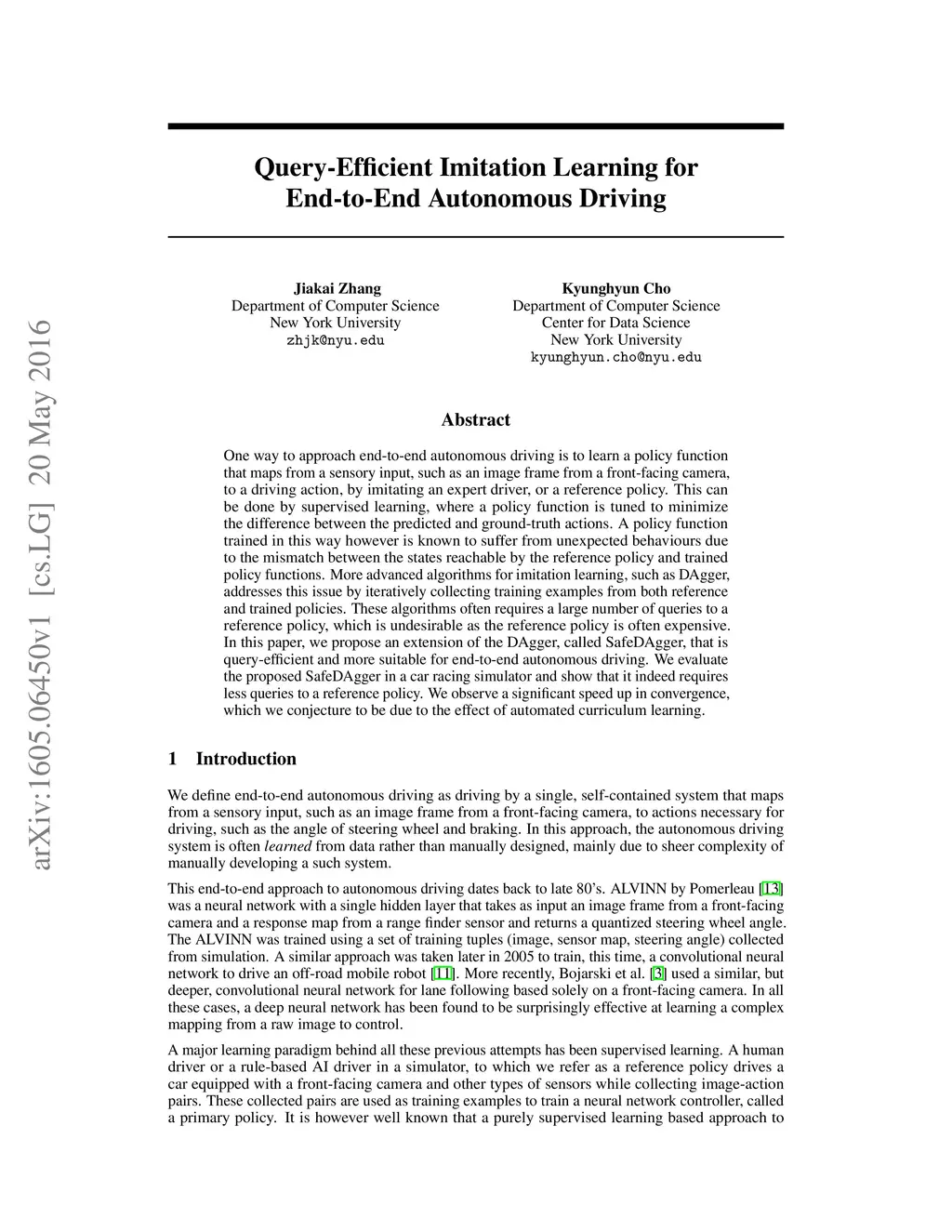 One way to approach end-to-end autonomous driving is to learn a policy function that maps from a sensory input, such as an image frame from a front-facing camera, to a driving action, by imitating an expert driver, or a reference policy. This can be done by supervised learning, where a policy function is tuned to minimize the difference between the predicted and ground-truth actions. A policy function trained in this way however is known to suffer from unexpected behaviours due to the mismatch between the states reachable by the reference policy and trained policy functions. More advanced algorithms for imitation learning, such as DAgger, addresses this issue by iteratively collecting training examples from both reference and trained policies. These algorithms often requires a large number of queries to a reference policy, which is undesirable as the reference policy is often expensive. In this paper, we propose an extension of the DAgger, called SafeDAgger, that is query-efficient and more suitable for end-to-end autonomous driving. We evaluate the proposed SafeDAgger in a car racing simulator and show that it indeed requires less queries to a reference policy. We observe a significant speed up in convergence, which we conjecture to be due to the effect of automated curriculum learning.