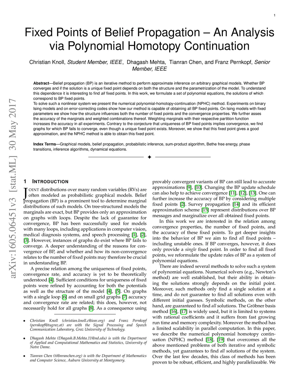 Belief propagation (BP) is an iterative method to perform approximate inference on arbitrary graphical models. Whether BP converges and if the solution is a unique fixed point depends on both the structure and the parametrization of the model. To understand this dependence it is interesting to find \emph{all} fixed points. In this work, we formulate a set of polynomial equations, the solutions of which correspond to BP fixed points. To solve such a nonlinear system we present the numerical polynomial-homotopy-continuation (NPHC) method. Experiments on binary Ising models and on error-correcting codes show how our method is capable of obtaining all BP fixed points. On Ising models with fixed parameters we show how the structure influences both the number of fixed points and the convergence properties. We further asses the accuracy of the marginals and weighted combinations thereof. Weighting marginals with their respective partition function increases the accuracy in all experiments. Contrary to the conjecture that uniqueness of BP fixed points implies convergence, we find graphs for which BP fails to converge, even though a unique fixed point exists. Moreover, we show that this fixed point gives a good approximation, and the NPHC method is able to obtain this fixed point.