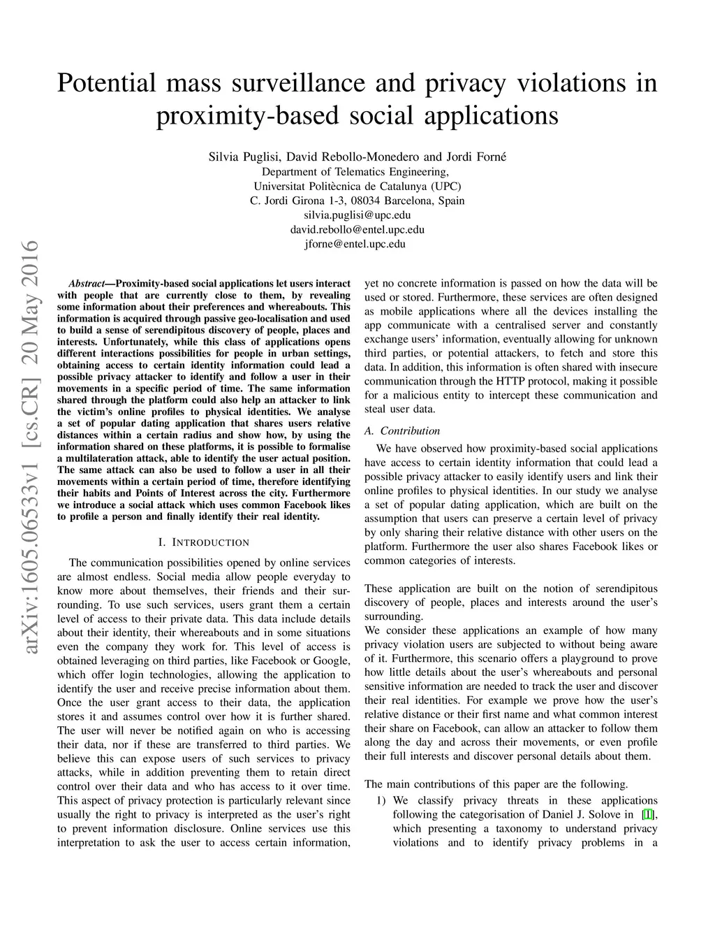 Proximity-based social applications let users interact with people that are currently close to them, by revealing some information about their preferences and whereabouts. This information is acquired through passive geo-localisation and used to build a sense of serendipitous discovery of people, places and interests. Unfortunately, while this class of applications opens different interactions possibilities for people in urban settings, obtaining access to certain identity information could lead a possible privacy attacker to identify and follow a user in their movements in a specific period of time. The same information shared through the platform could also help an attacker to link the victim's online profiles to physical identities. We analyse a set of popular dating application that shares users relative distances within a certain radius and show how, by using the information shared on these platforms, it is possible to formalise a multilateration attack, able to identify the user actual position. The same attack can also be used to follow a user in all their movements within a certain period of time, therefore identifying their habits and Points of Interest across the city. Furthermore we introduce a social attack which uses common Facebook likes to profile a person and finally identify their real identity.