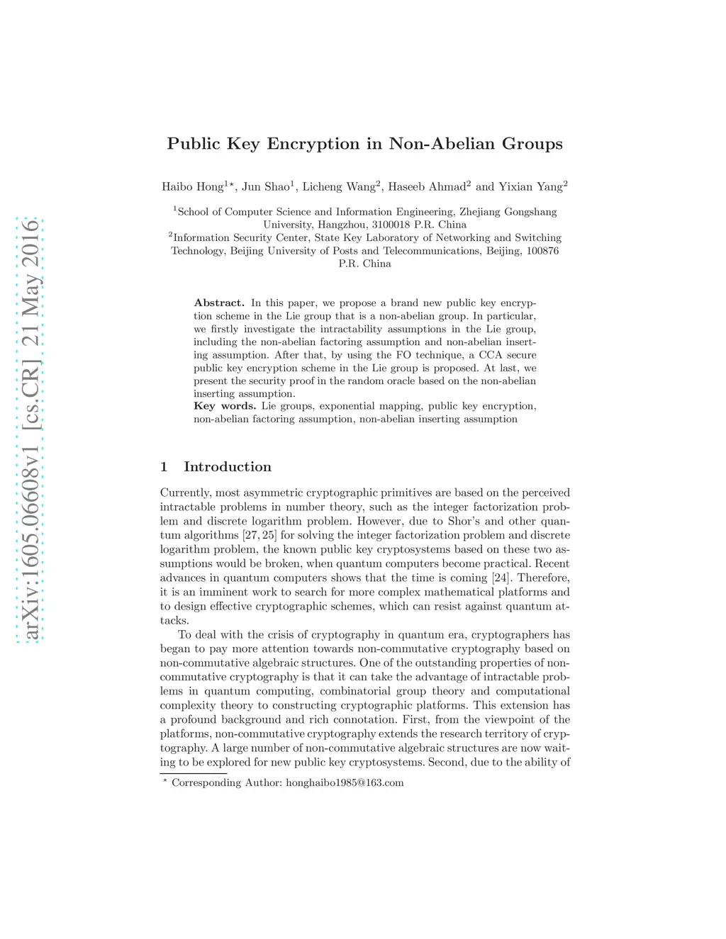 In this paper, we propose a brand new public key encryption scheme in the Lie group that is a non-abelian group. In particular, we firstly investigate the intractability assumptions in the Lie group, including the non-abelian factoring assumption and non-abelian inserting assumption. After that, by using the FO technique, a CCA secure public key encryption scheme in the Lie group is proposed. At last, we present the security proof in the random oracle based on the non-abelian inserting assumption.