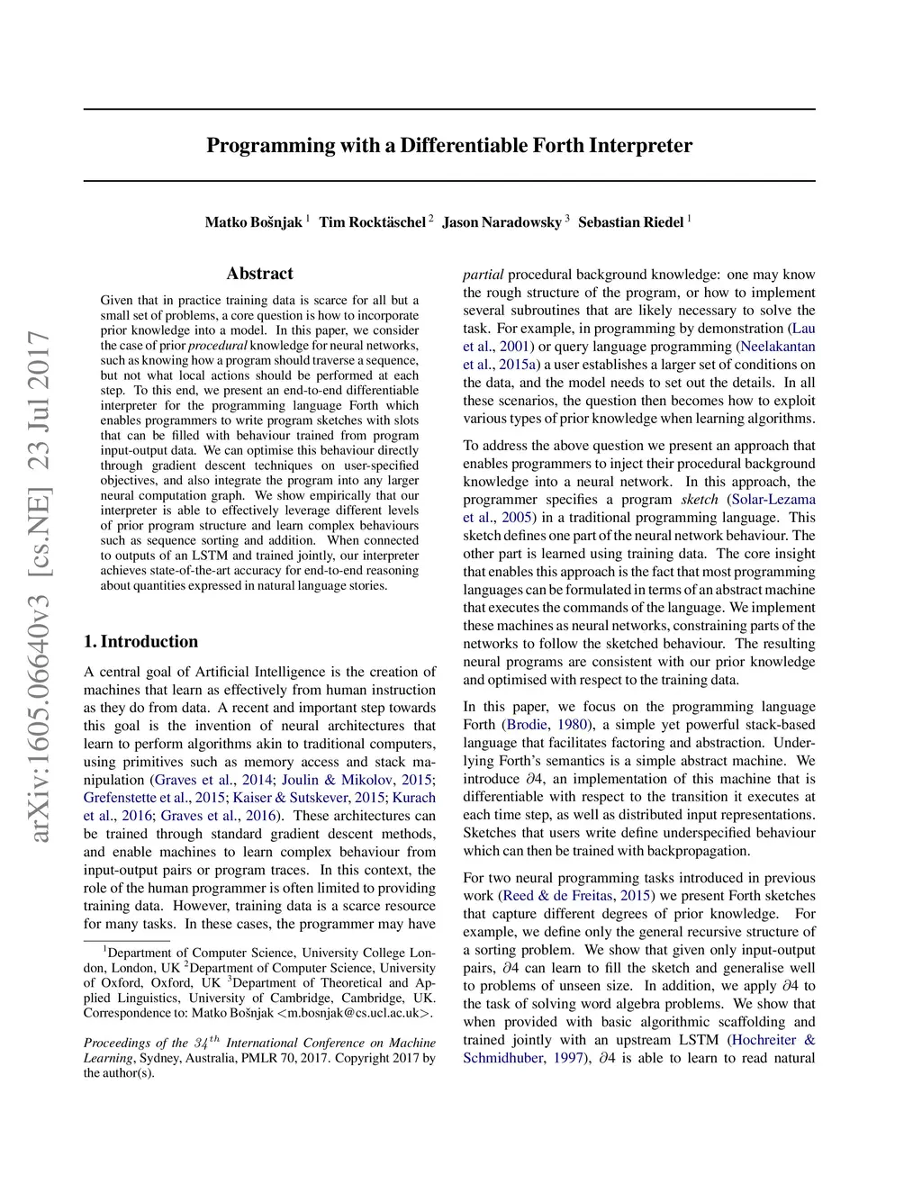 There are families of neural networks that can learn to compute any function, provided sufficient training data. However, given that in practice training data is scarce for all but a small set of problems, a core question is how to incorporate prior knowledge into a model. Here we consider the case of prior procedural knowledge, such as knowing the overall recursive structure of a sequence transduction program or the fact that a program will likely use arithmetic operations on real numbers to solve a task. To this end we present a differentiable interpreter for the programming language Forth. Through a neural implementation of the dual stack machine that underlies Forth, programmers can write program sketches with slots that can be filled with behaviour trained from program input-output data. As the program interpreter is end-to-end differentiable, we can optimize this behaviour directly through gradient descent techniques on user specified objectives, and also integrate the program into any larger neural computation graph. We show empirically that our interpreter is able to effectively leverage different levels of prior program structure and learn complex transduction tasks such as sequence sorting or addition with substantially less data and better generalisation over problem sizes. In addition, we introduce neural program optimisations based on symbolic computation and parallel branching that lead to significant speed improvements.