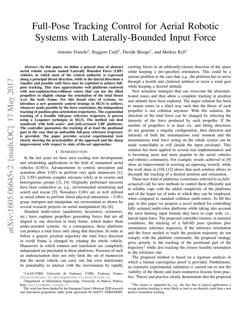 In this paper, we define a general class of abstract aerial robotic systems named Laterally Bounded Force (LBF) vehicles, in which most of the control authority is expressed along a principal thrust direction, while in the lateral directions a (smaller and possibly null) force may be exploited to achieve full-pose tracking. This class approximates well platforms endowed with non-coplanar/non-collinear rotors that can use the tilted propellers to slightly change the orientation of the total thrust w.r.t. the body frame. For this broad class of systems, we introduce a new geometric control strategy in SE(3) to achieve, whenever made possible by the force constraints, the independent tracking of position-plus-orientation trajectories. The exponential tracking of a feasible full-pose reference trajectory is proven using a Lyapunov technique in SE(3). The method can deal seamlessly with both under- and fully-actuated LBF platforms. The controller guarantees the tracking of at least the positional part in the case that an unfeasible full-pose reference trajectory is provided. The paper provides several experimental tests clearly showing the practicability of the approach and the sharp improvement with respect to state of-the-art approaches.