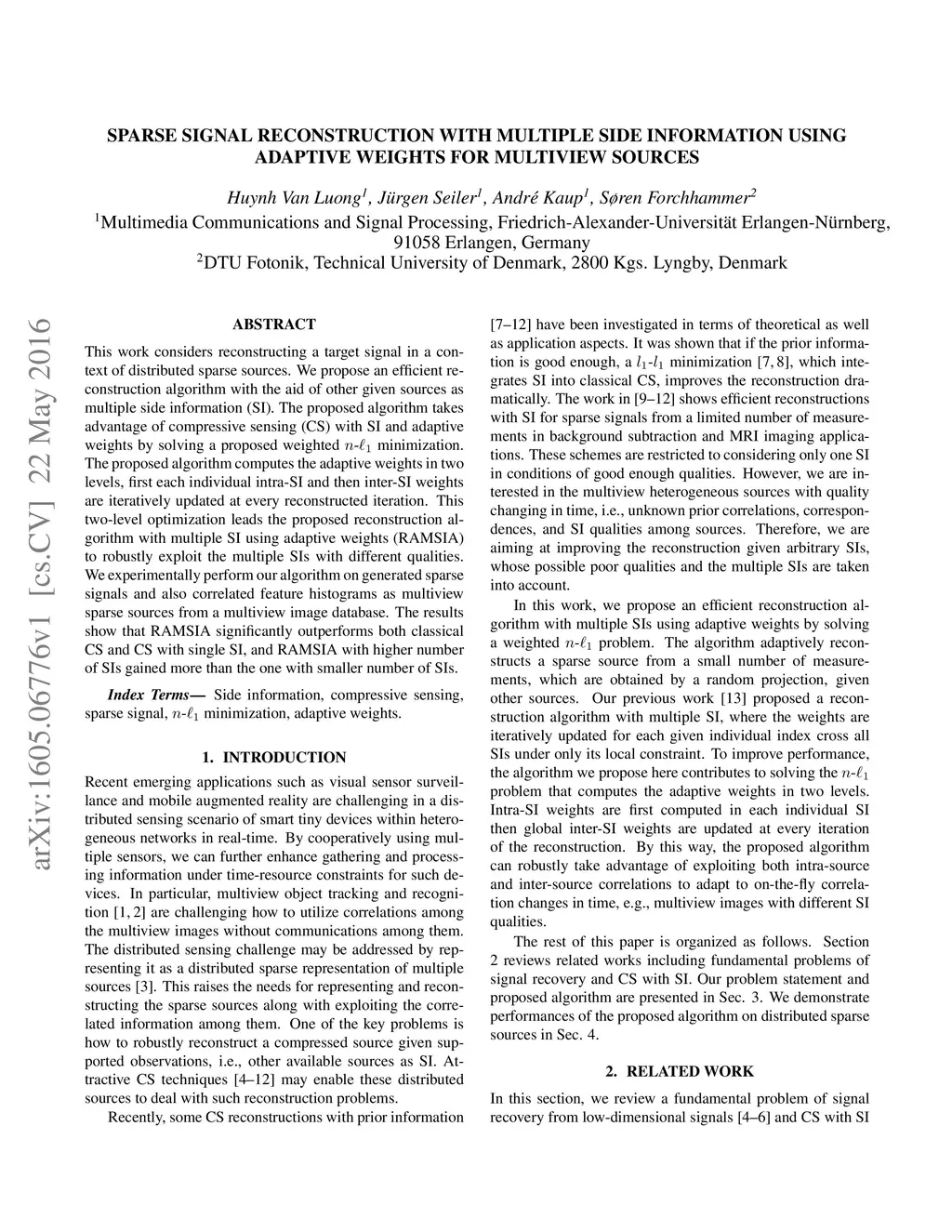 This work considers reconstructing a target signal in a context of distributed sparse sources. We propose an efficient reconstruction algorithm with the aid of other given sources as multiple side information (SI). The proposed algorithm takes advantage of compressive sensing (CS) with SI and adaptive weights by solving a proposed weighted - minimization. The proposed algorithm computes the adaptive weights in two levels, first each individual intra-SI and then inter-SI weights are iteratively updated at every reconstructed iteration. This two-level optimization leads the proposed reconstruction algorithm with multiple SI using adaptive weights (RAMSIA) to robustly exploit the multiple SIs with different qualities. We experimentally perform our algorithm on generated sparse signals and also correlated feature histograms as multiview sparse sources from a multiview image database. The results show that RAMSIA significantly outperforms both classical CS and CS with single SI, and RAMSIA with higher number of SIs gained more than the one with smaller number of SIs.