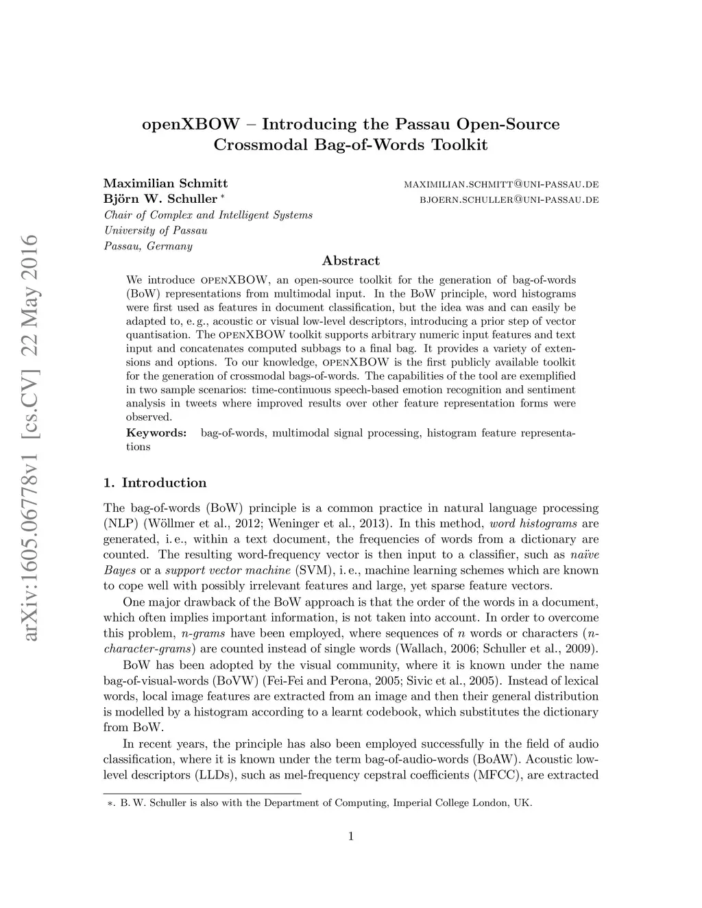 openXBOW - Introducing the Passau Open-Source Crossmodal Bag-of-Words