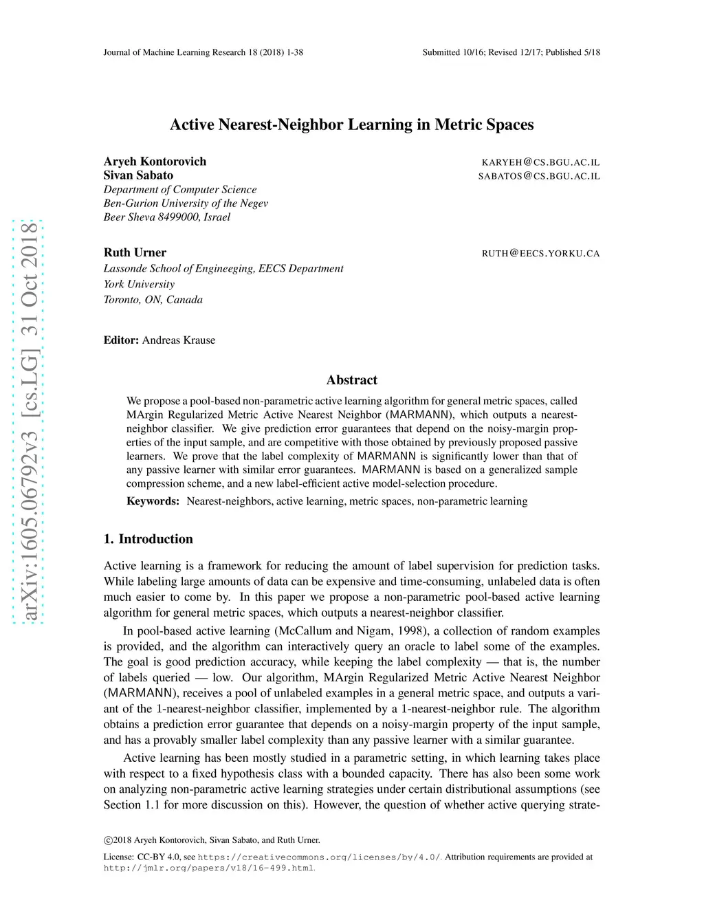 We propose a pool-based non-parametric active learning algorithm for general metric spaces, called MArgin Regularized Metric Active Nearest Neighbor (MARMANN), which outputs a nearest-neighbor classifier. We give prediction error guarantees that depend on the noisy-margin properties of the input sample, and are competitive with those obtained by previously proposed passive learners. We prove that the label complexity of MARMANN is significantly lower than that of any passive learner with similar error guarantees. MARMANN is based on a generalized sample compression scheme, and a new label-efficient active model-selection procedure.