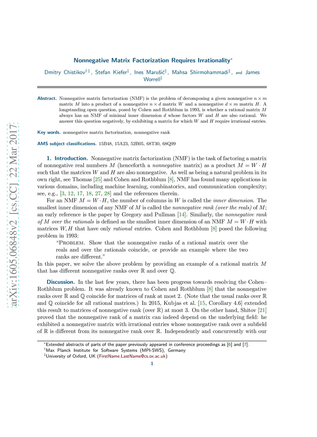 Nonnegative matrix factorization (NMF) is the problem of decomposing a given nonnegative matrix into a product of a nonnegative matrix and a nonnegative matrix . A longstanding open question, posed by Cohen and Rothblum in 1993, is whether a rational matrix always has an NMF of minimal inner dimension whose factors and are also rational. We answer this question negatively, by exhibiting a matrix for which and require irrational entries.