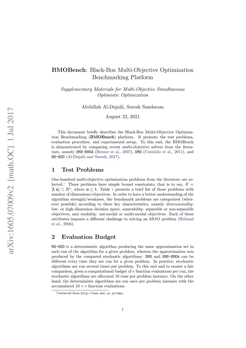 This document briefly describes the Black-Box Multi-Objective Optimization Benchmarking (BMOBench) platform. It presents the test problems, evaluation procedure, and experimental setup. To this end, the BMOBench is demonstrated by comparing recent multi-objective solvers from the literature, namely SMS-EMOA, DMS, and MO-SOO.