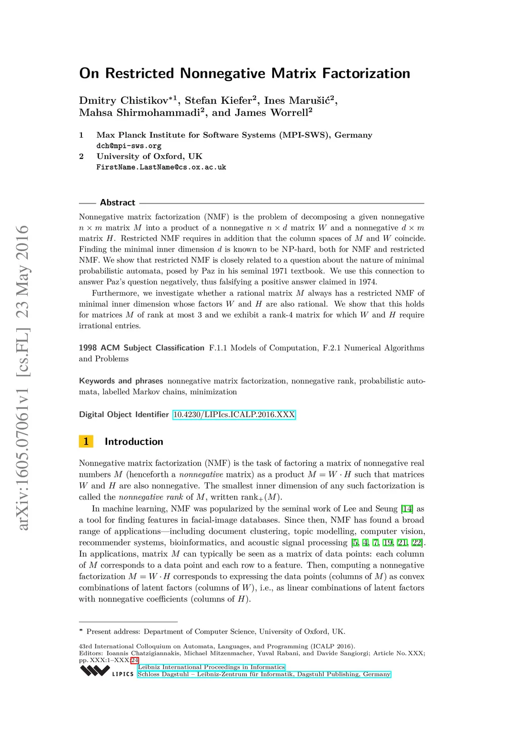 On Restricted Nonnegative Matrix Factorization