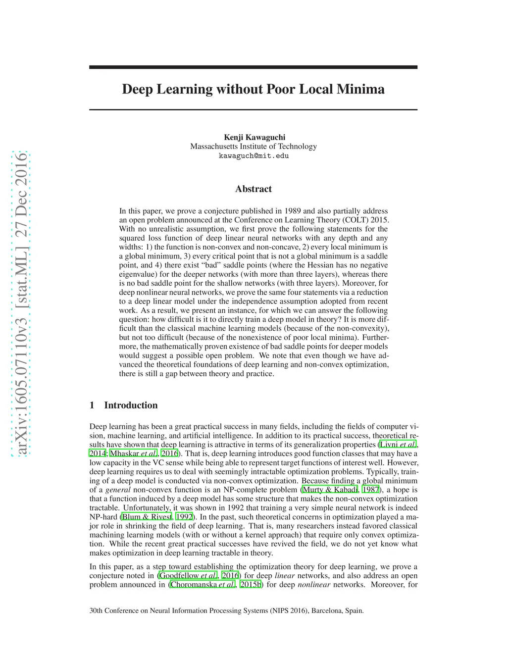 In this paper, we prove a conjecture published in 1989 and also partially address an open problem announced at the Conference on Learning Theory (COLT) 2015. With no unrealistic assumption, we first prove the following statements for the squared loss function of deep linear neural networks with any depth and any widths: 1) the function is non-convex and non-concave, 2) every local minimum is a global minimum, 3) every critical point that is not a global minimum is a saddle point, and 4) there exist "bad" saddle points (where the Hessian has no negative eigenvalue) for the deeper networks (with more than three layers), whereas there is no bad saddle point for the shallow networks (with three layers). Moreover, for deep nonlinear neural networks, we prove the same four statements via a reduction to a deep linear model under the independence assumption adopted from recent work. As a result, we present an instance, for which we can answer the following question: how difficult is it to directly train a deep model in theory? It is more difficult than the classical machine learning models (because of the non-convexity), but not too difficult (because of the nonexistence of poor local minima). Furthermore, the mathematically proven existence of bad saddle points for deeper models would suggest a possible open problem. We note that even though we have advanced the theoretical foundations of deep learning and non-convex optimization, there is still a gap between theory and practice.